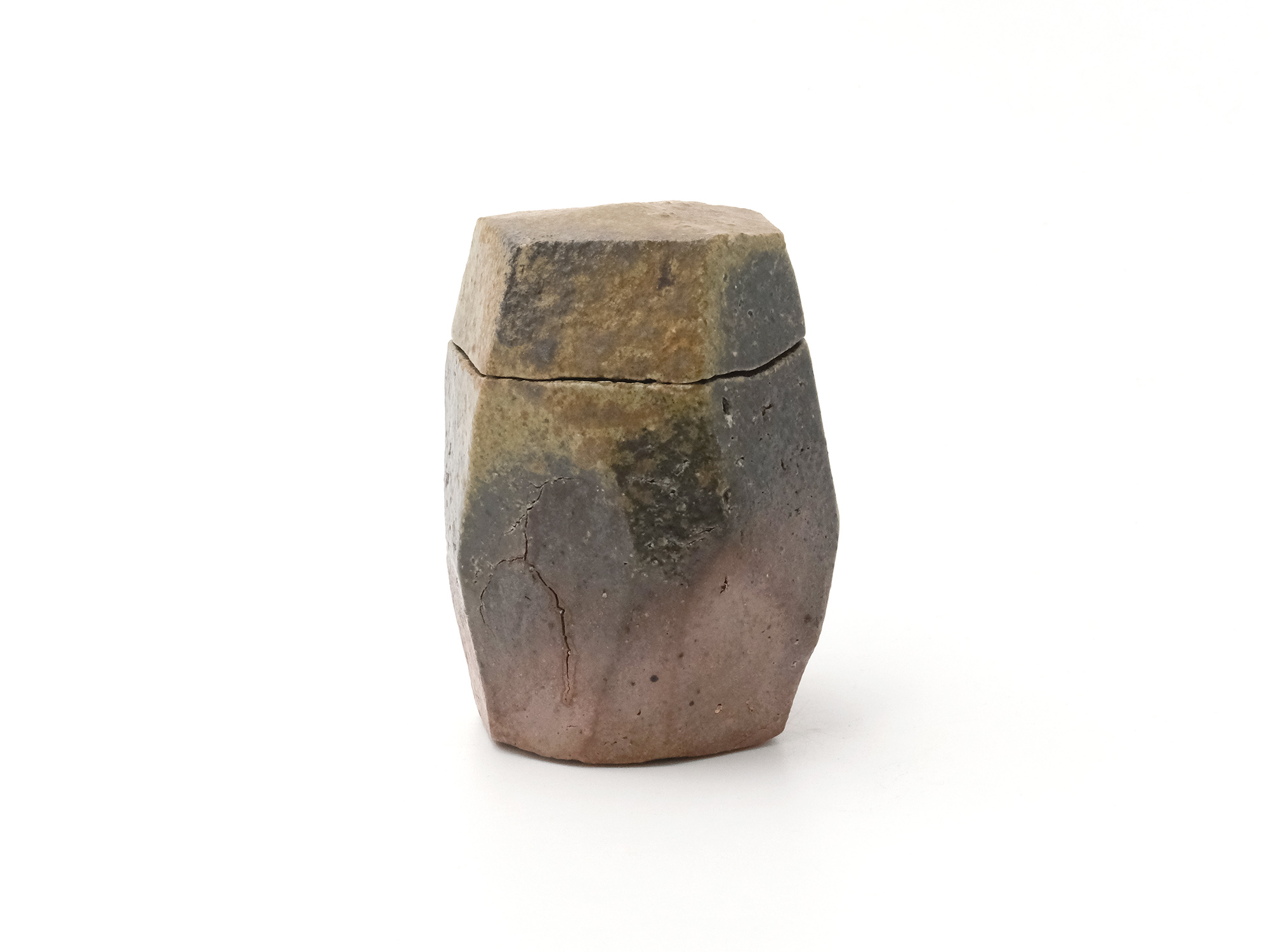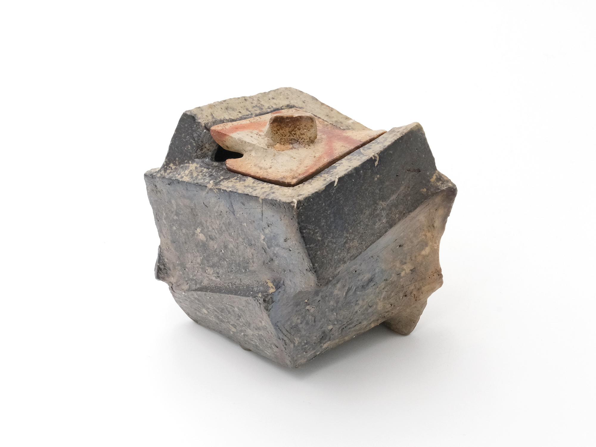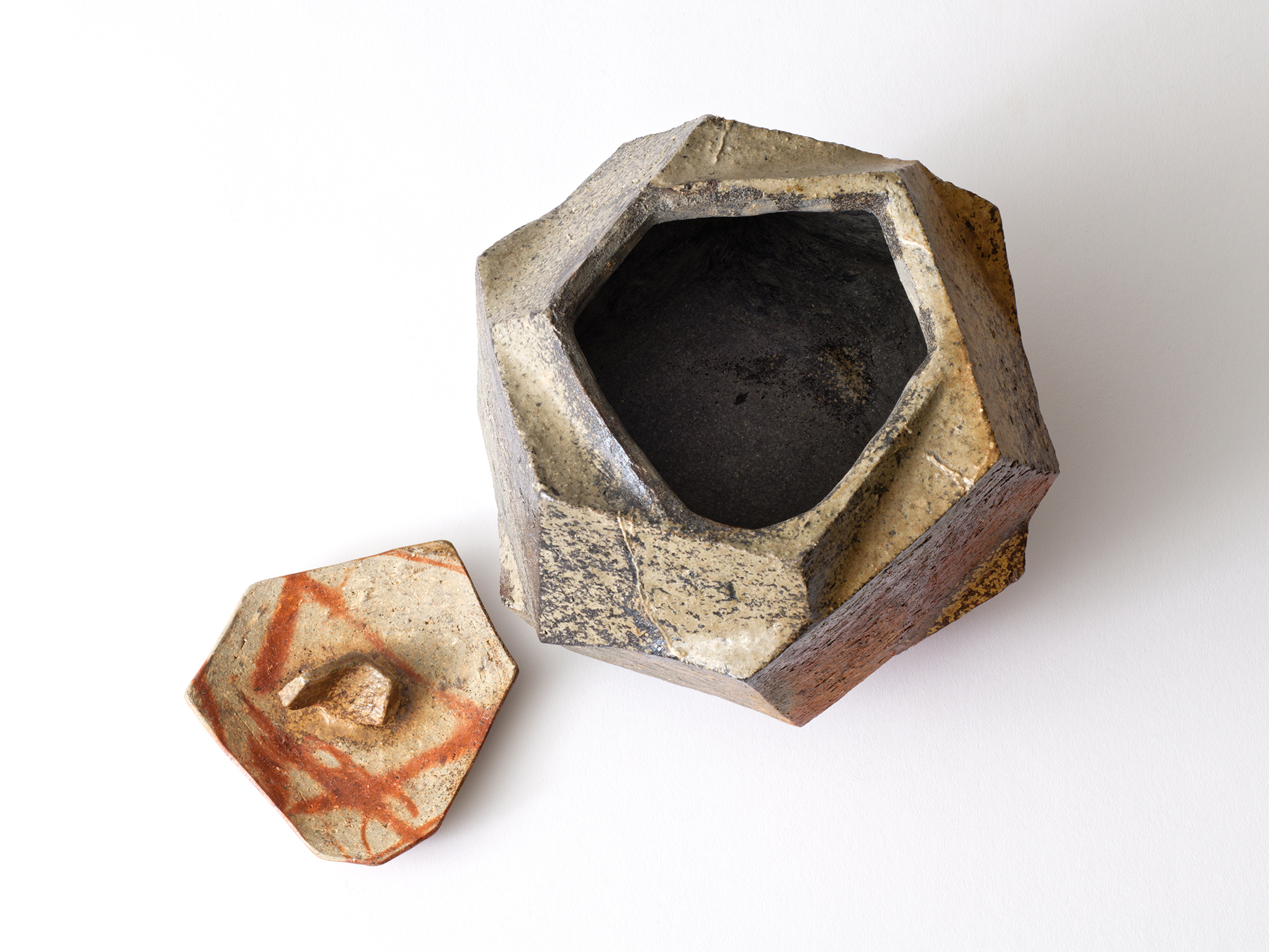 豊福 博の《自然練込水指》は、粘土を掘りだしたままの状態で表現する自然練込の作品です。 六角形を基本に面と面を複雑に組み合わせた造形で、見る角度によって姿が変わります。 また、色違いに焼き上がった蓋や青灰色と緋色のコントラストが素晴らしい水指です。