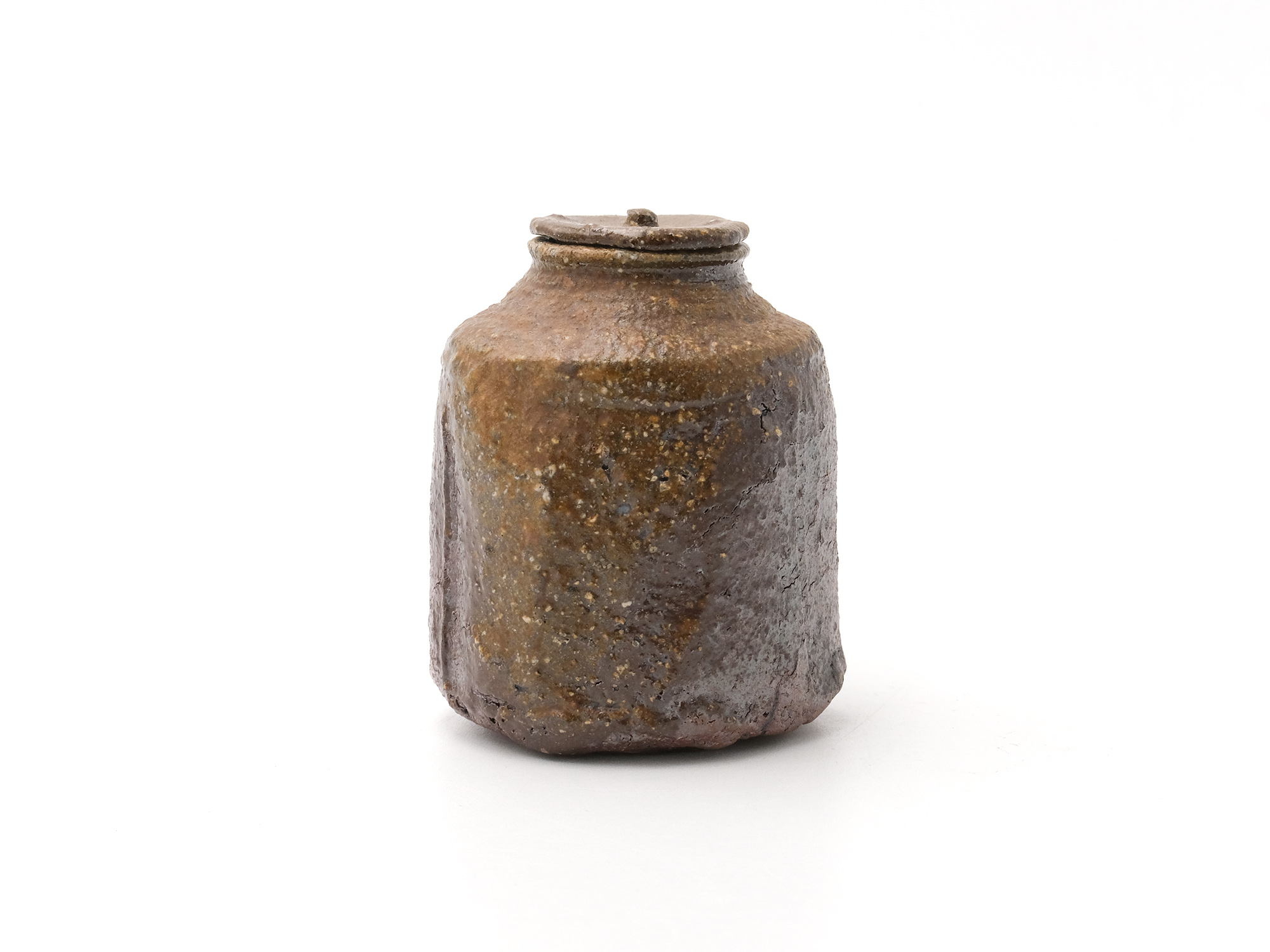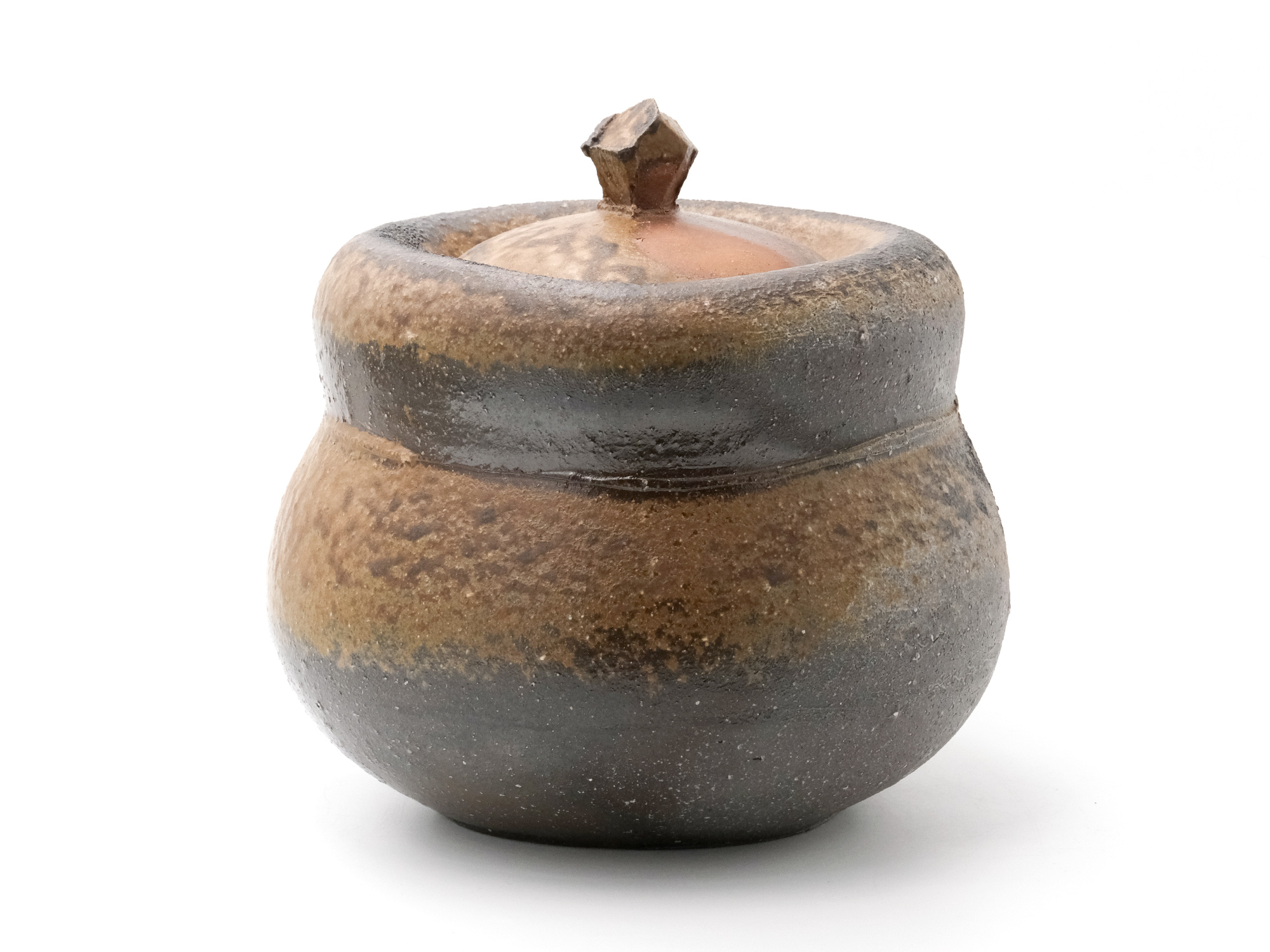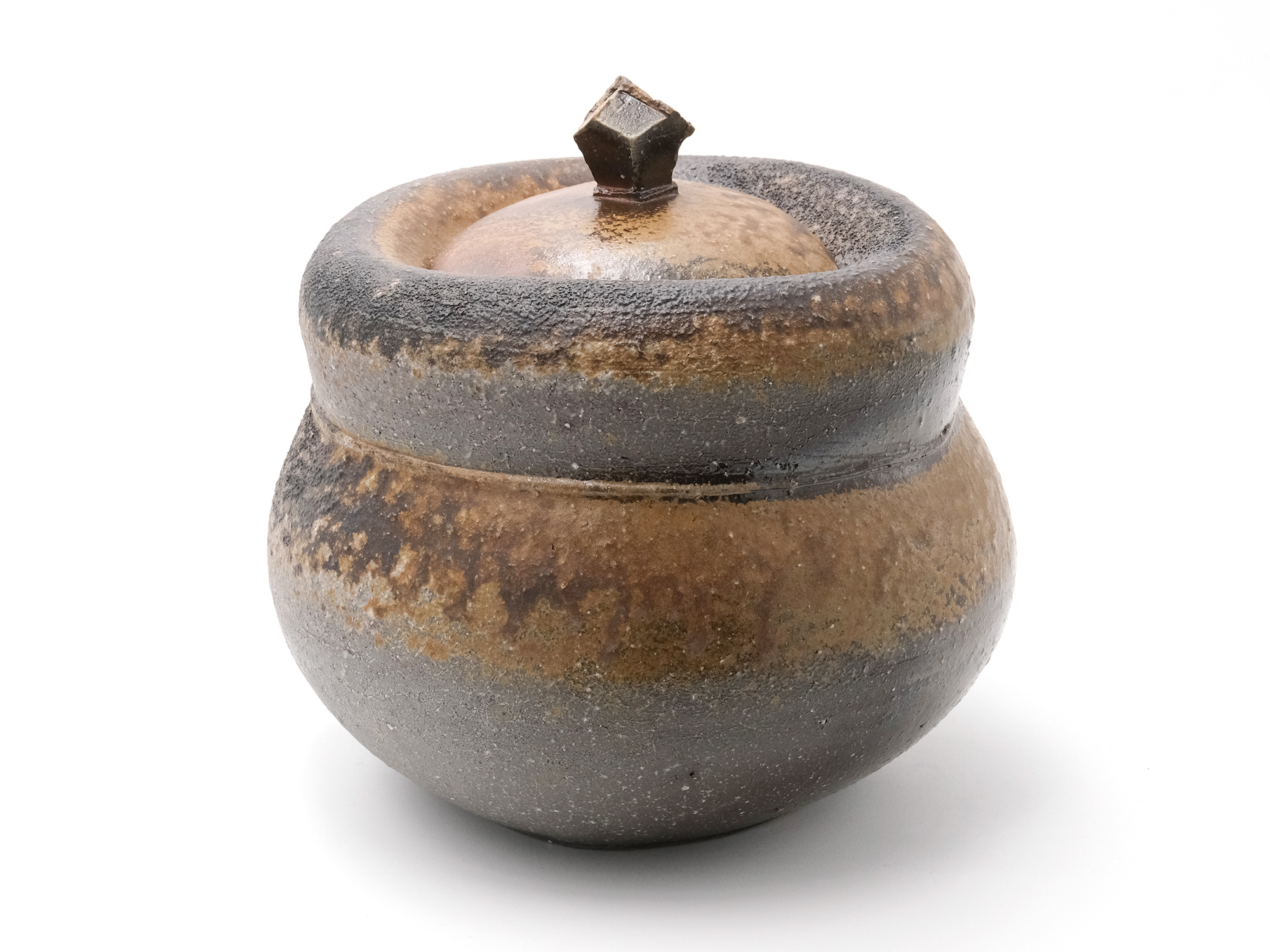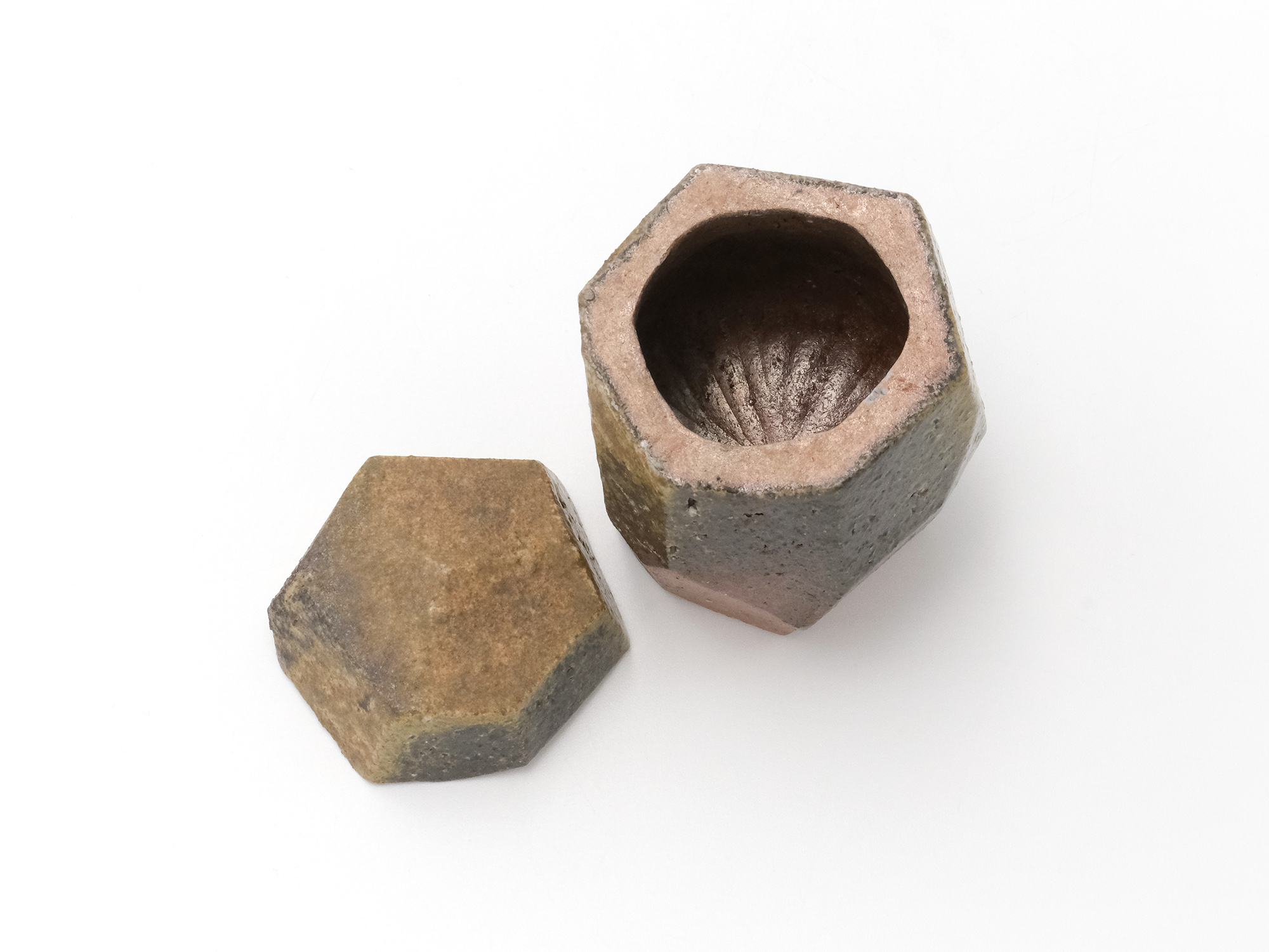豊福 博の《自然練込水指》は、粘土を掘りだしたままの状態で表現する自然練込の作品です。 六角形を基本に面と面を複雑に組み合わせた造形で、見る角度によって姿が変わります。 また、色違いに焼き上がった蓋や青灰色と緋色のコントラストが素晴らしい水指です。