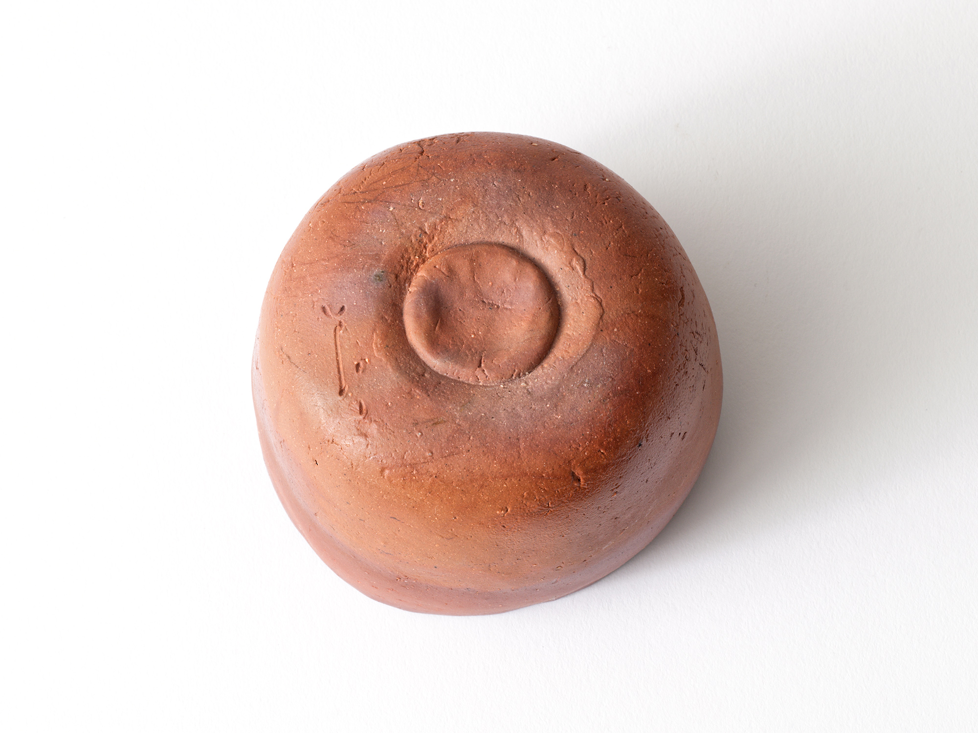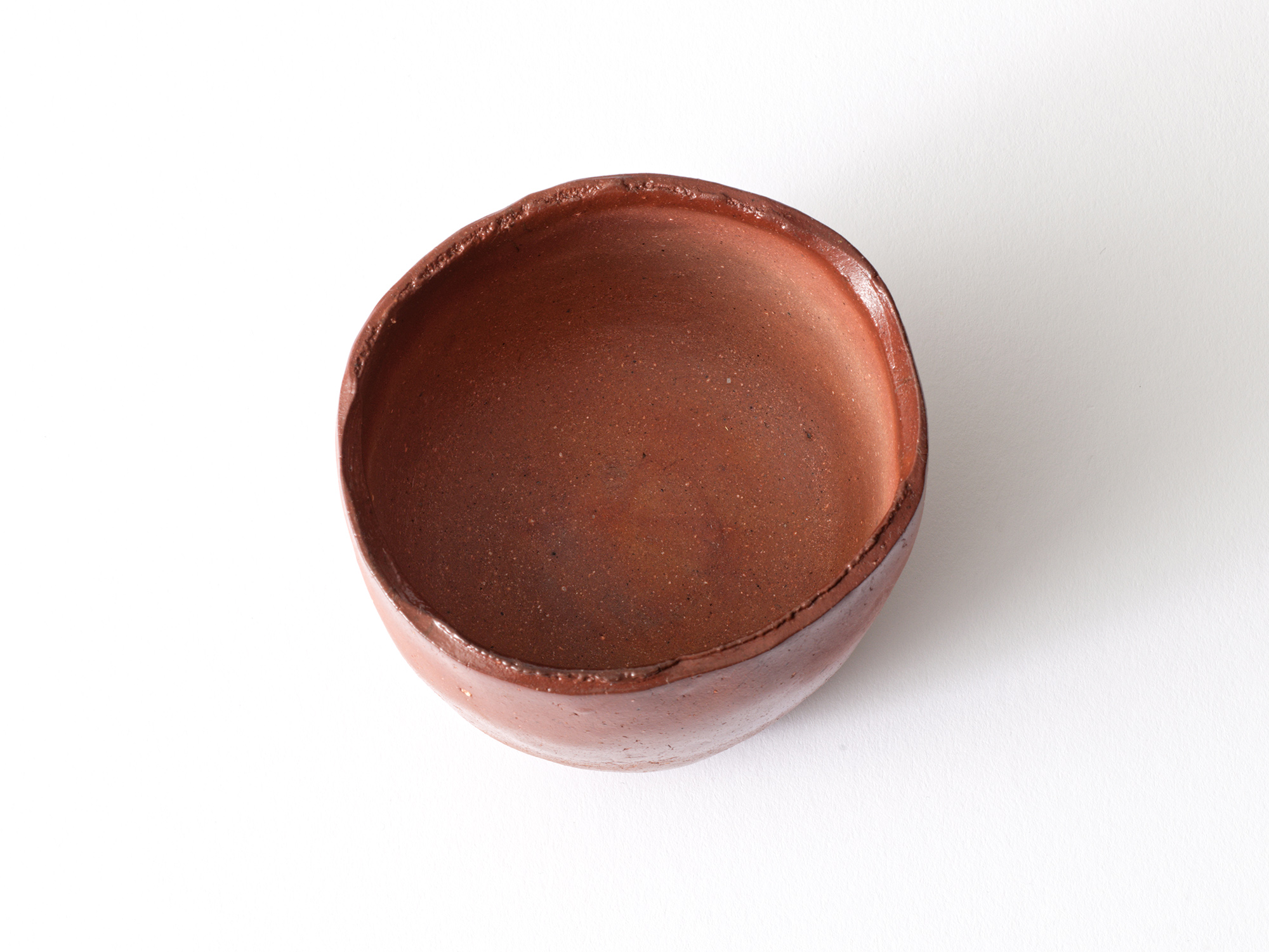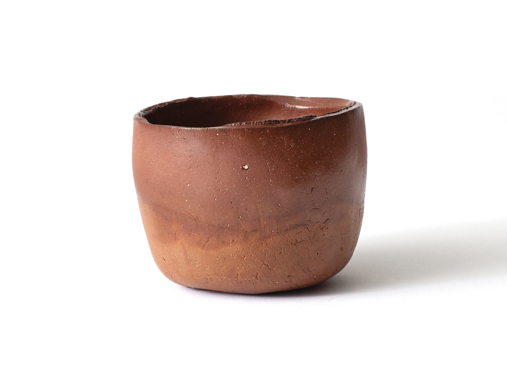 高島聡平の《備前緋色盌》は新しく作り直した穴窯で焼成した、いままで見たことのない焼けの茶盌です。 やきものの源である備前土の特性を追求し、圧倒的な発色の良さと上下の火色のコントラストを表現しています。 光悦の赤楽茶碗「乙御前(おとごぜ)」風の高台がユニークです。