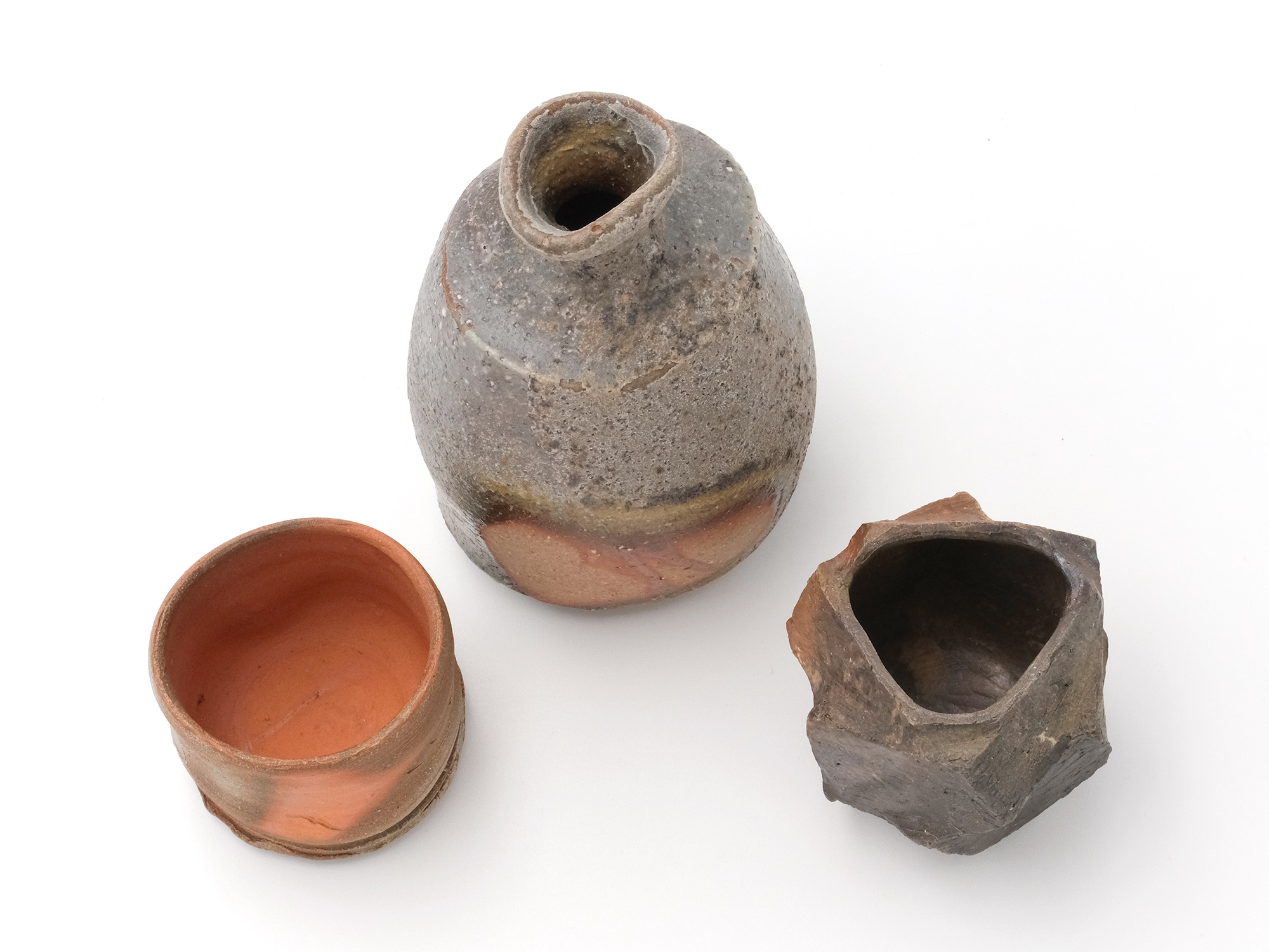 | 作品名 | [左] 緋筒盃【ご売約済】 [中] 備前 徳利 [右] 自然練込ぐい呑 |