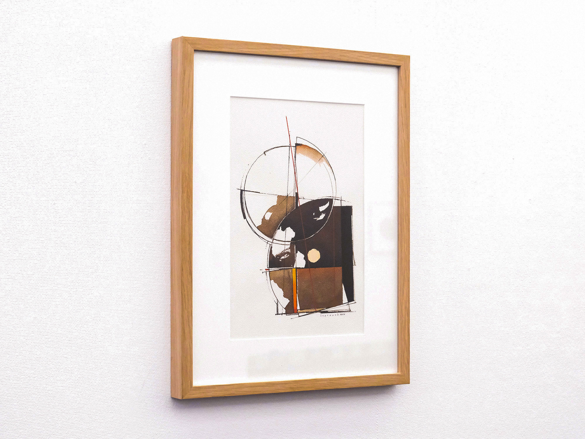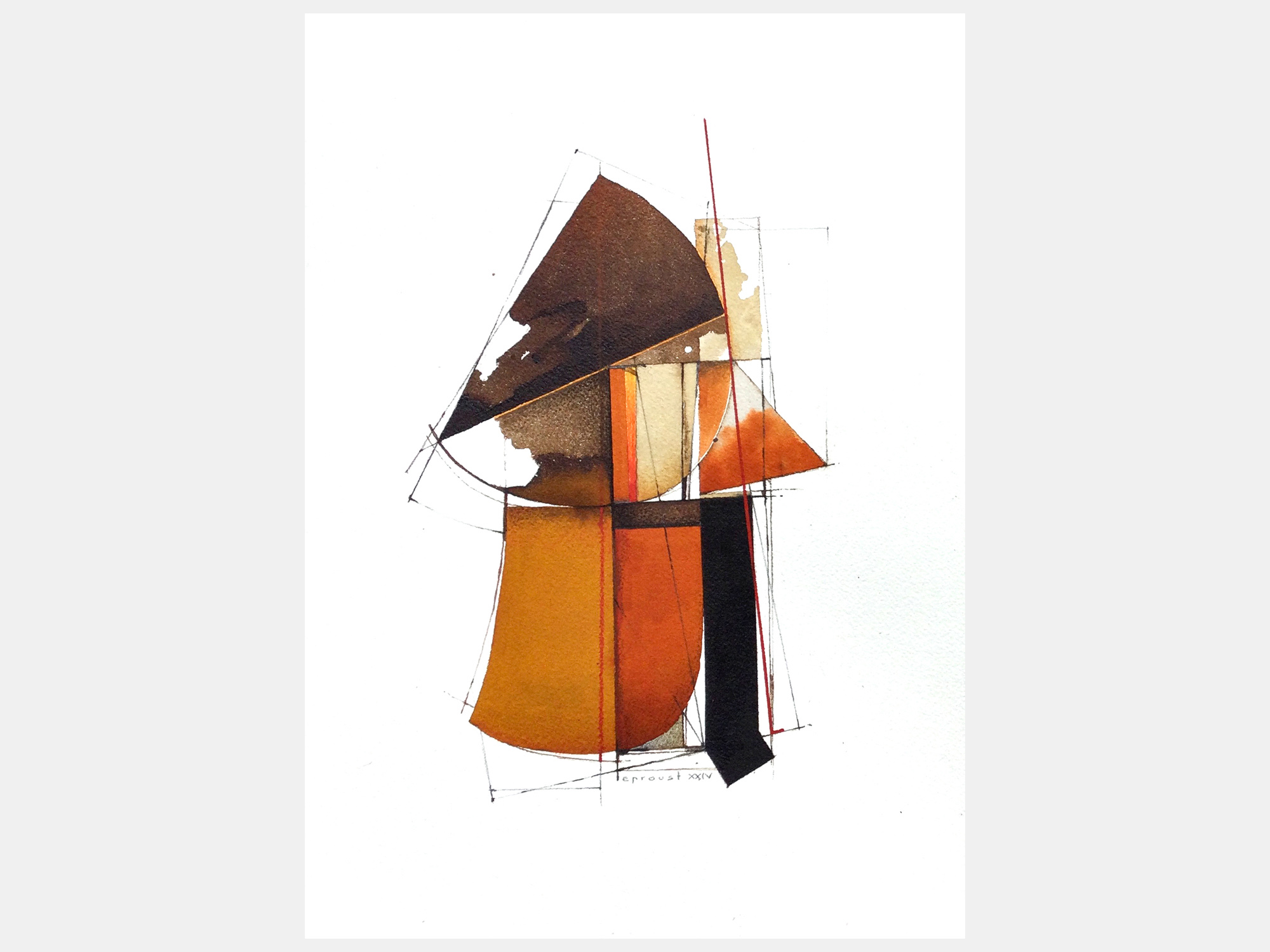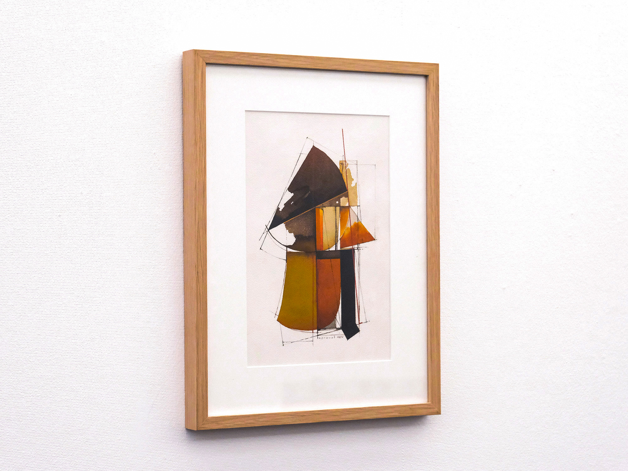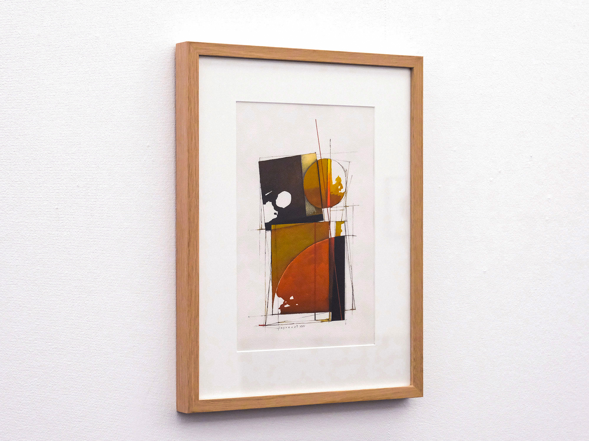 他方、抽象画家のティエリー・ルプルーストさんは、パリなどにアトリエを持ち製作されています。 内装建築を学んだ後、画業の他にも、オペラや演劇で舞台芸術を手がけるほか、映画の美術監督も務めて来られました。 その作品は、そうしたご経歴からか、建築設計図の様な趣で、さまざまな線や図形が縦横無尽に交わる絵で欧州では人気を博しております。