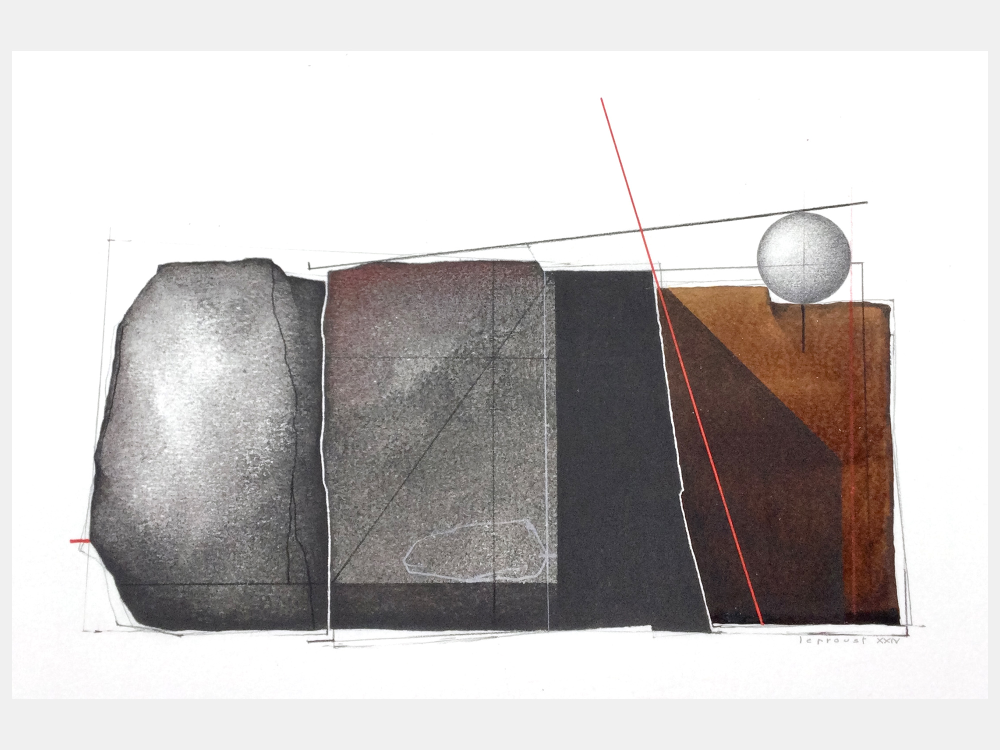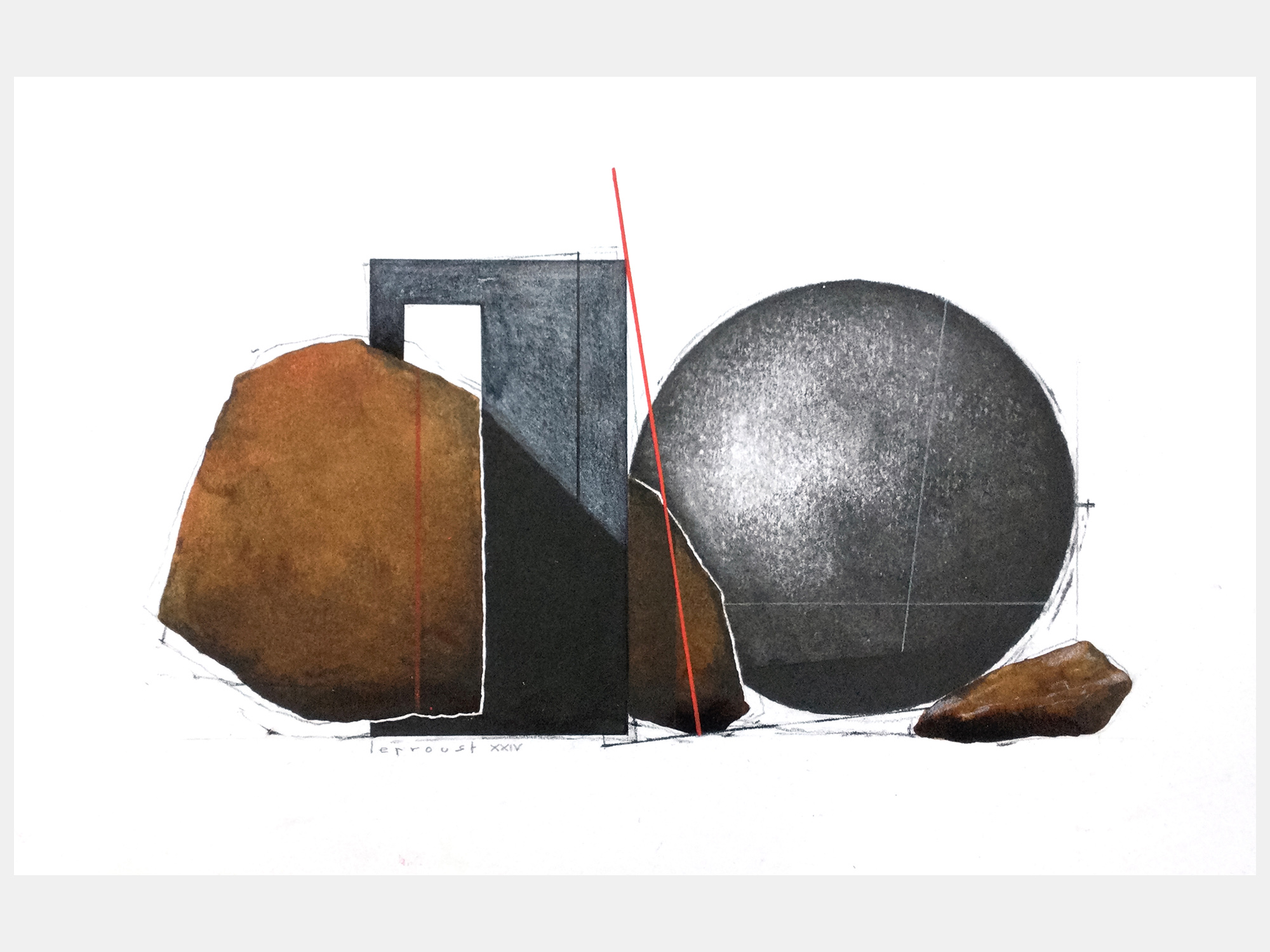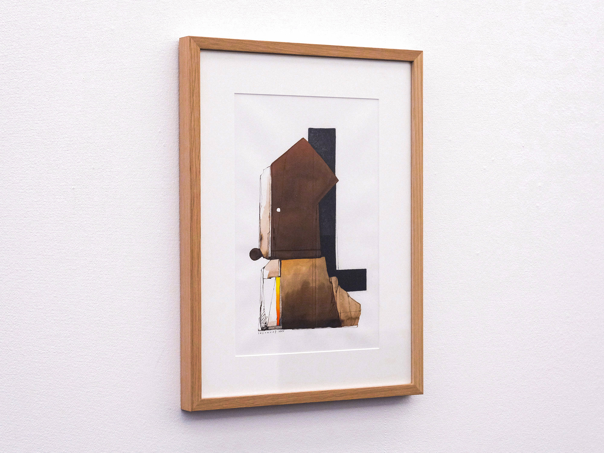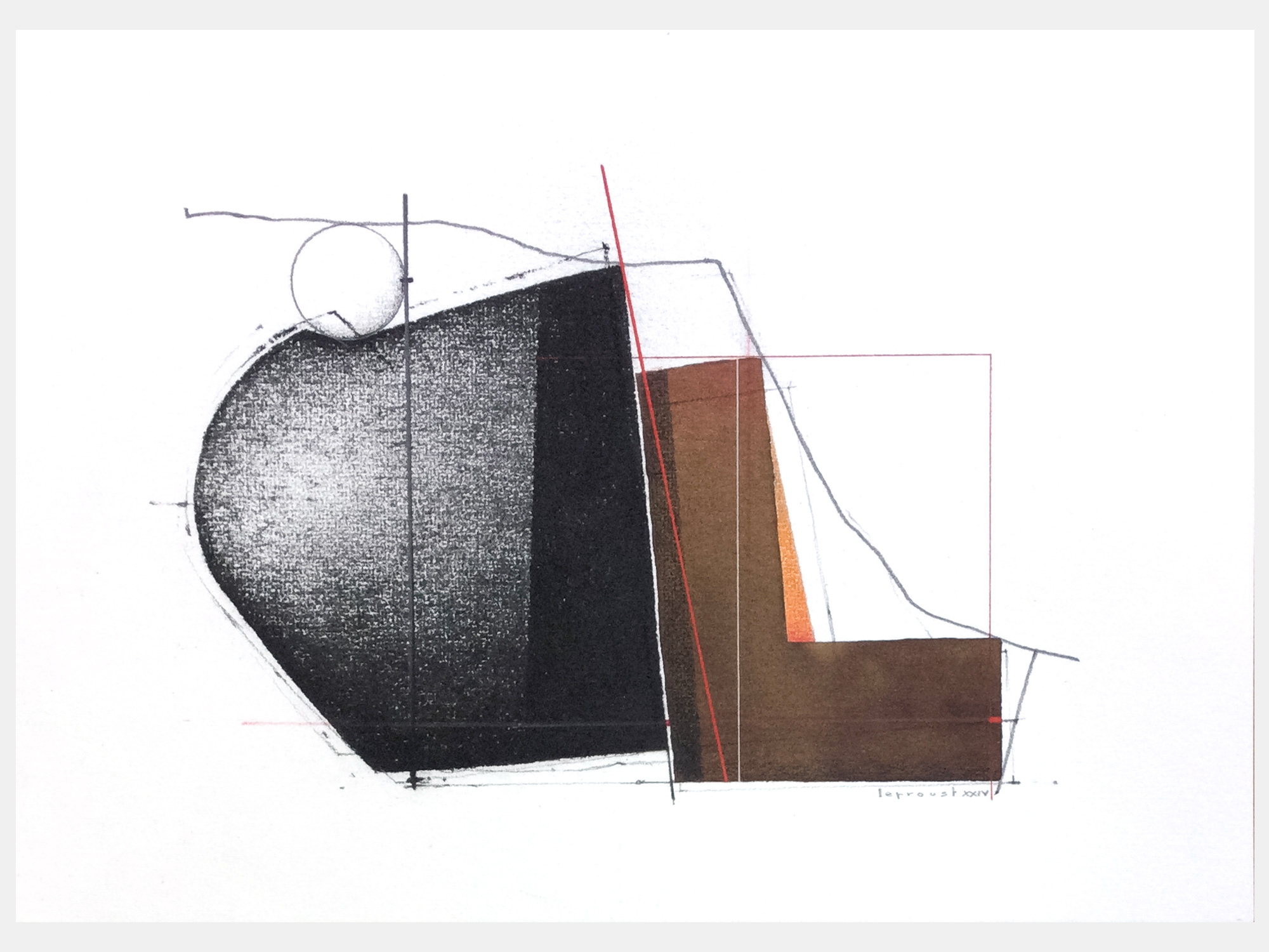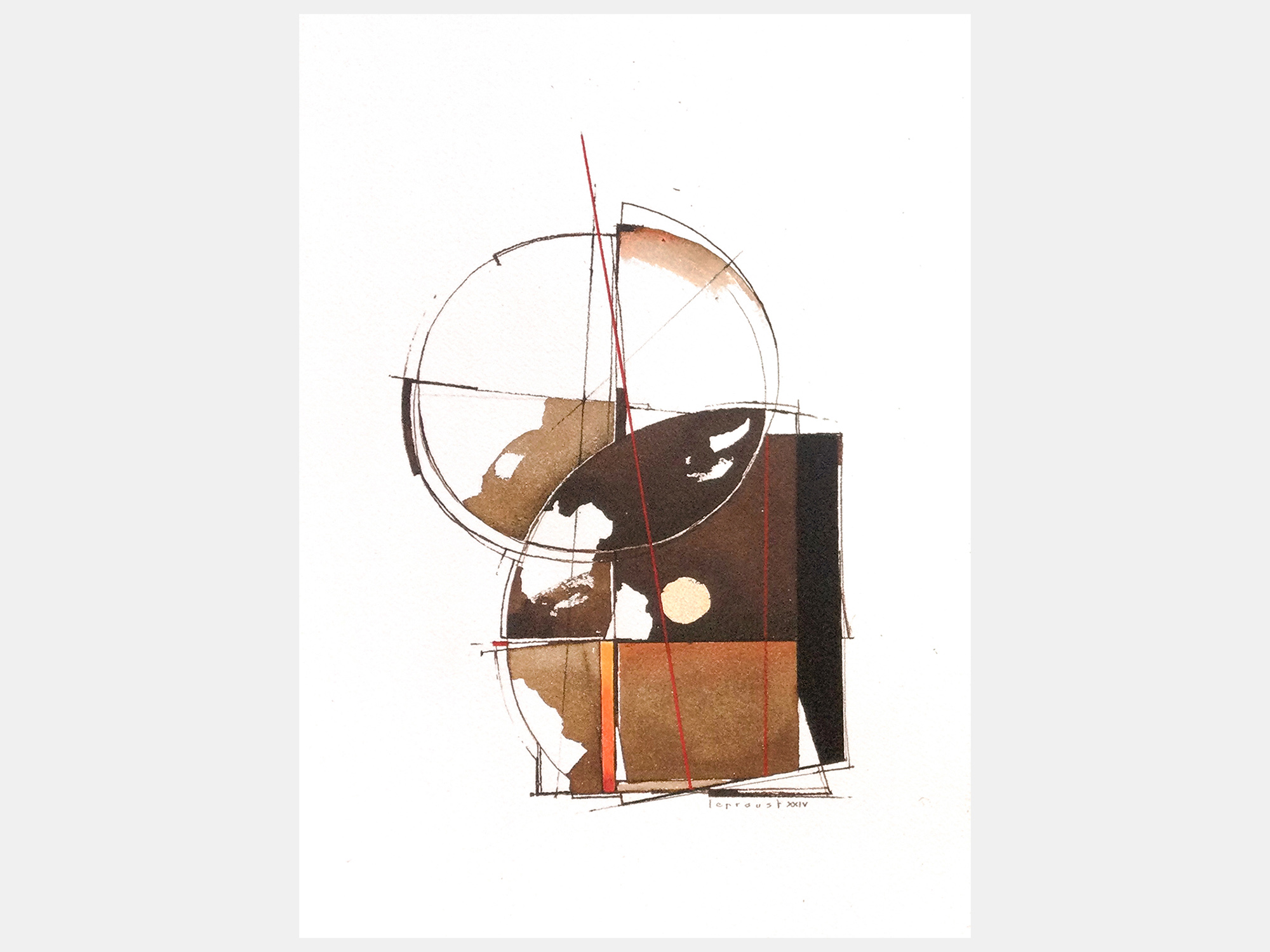 他方、抽象画家のティエリー・ルプルーストさんは、パリなどにアトリエを持ち製作されています。 内装建築を学んだ後、画業の他にも、オペラや演劇で舞台芸術を手がけるほか、映画の美術監督も務めて来られました。 その作品は、そうしたご経歴からか、建築設計図の様な趣で、さまざまな線や図形が縦横無尽に交わる絵で欧州では人気を博しております。