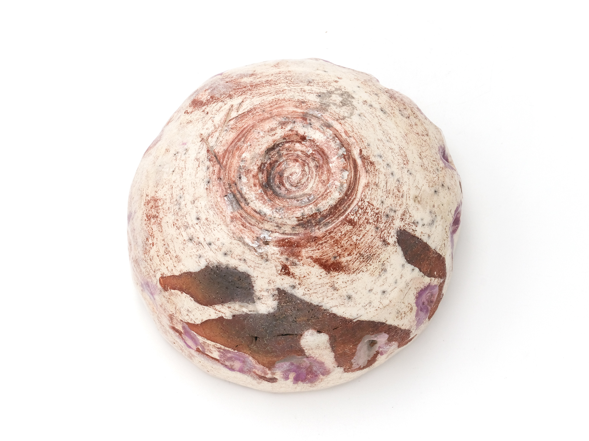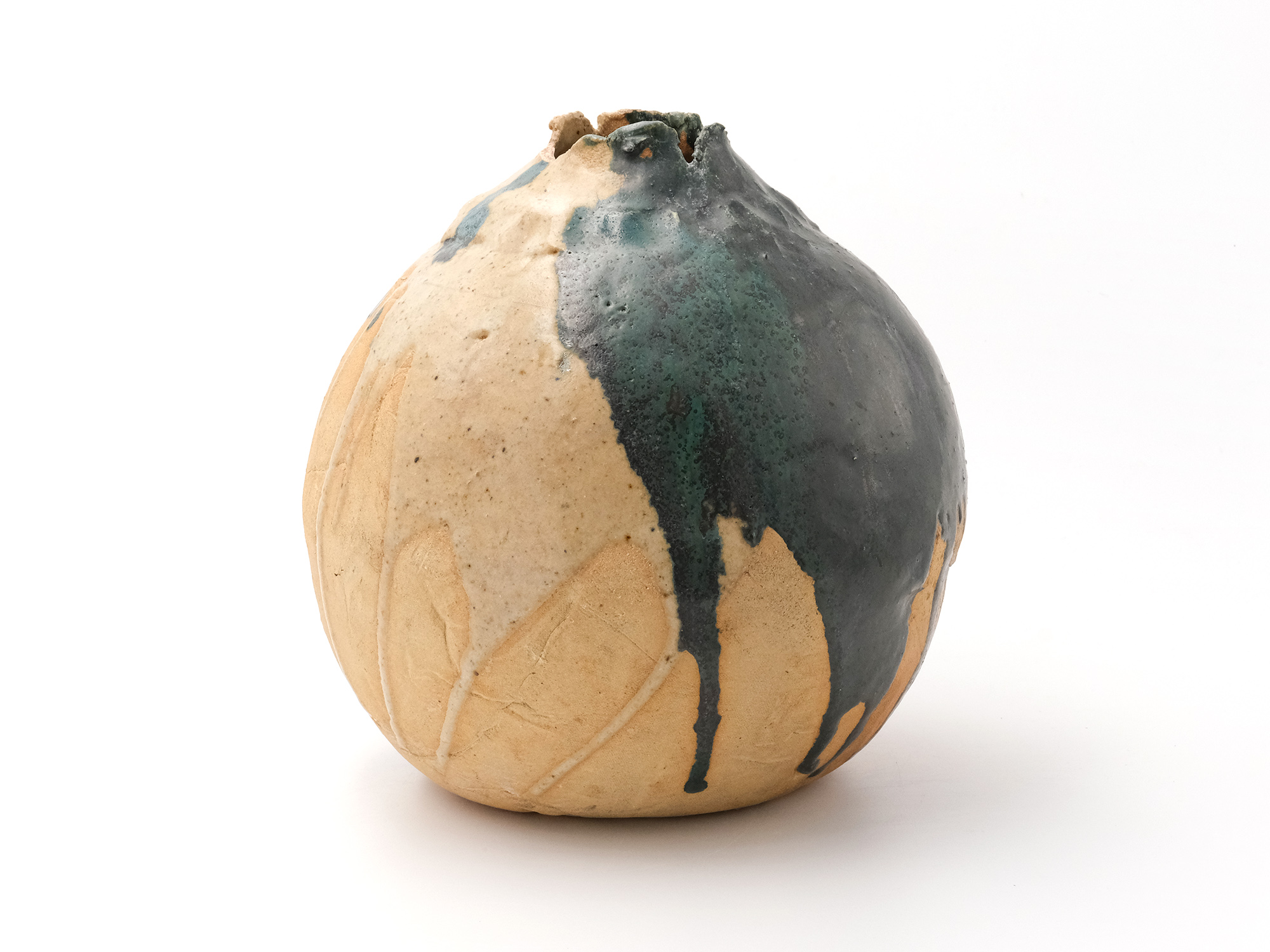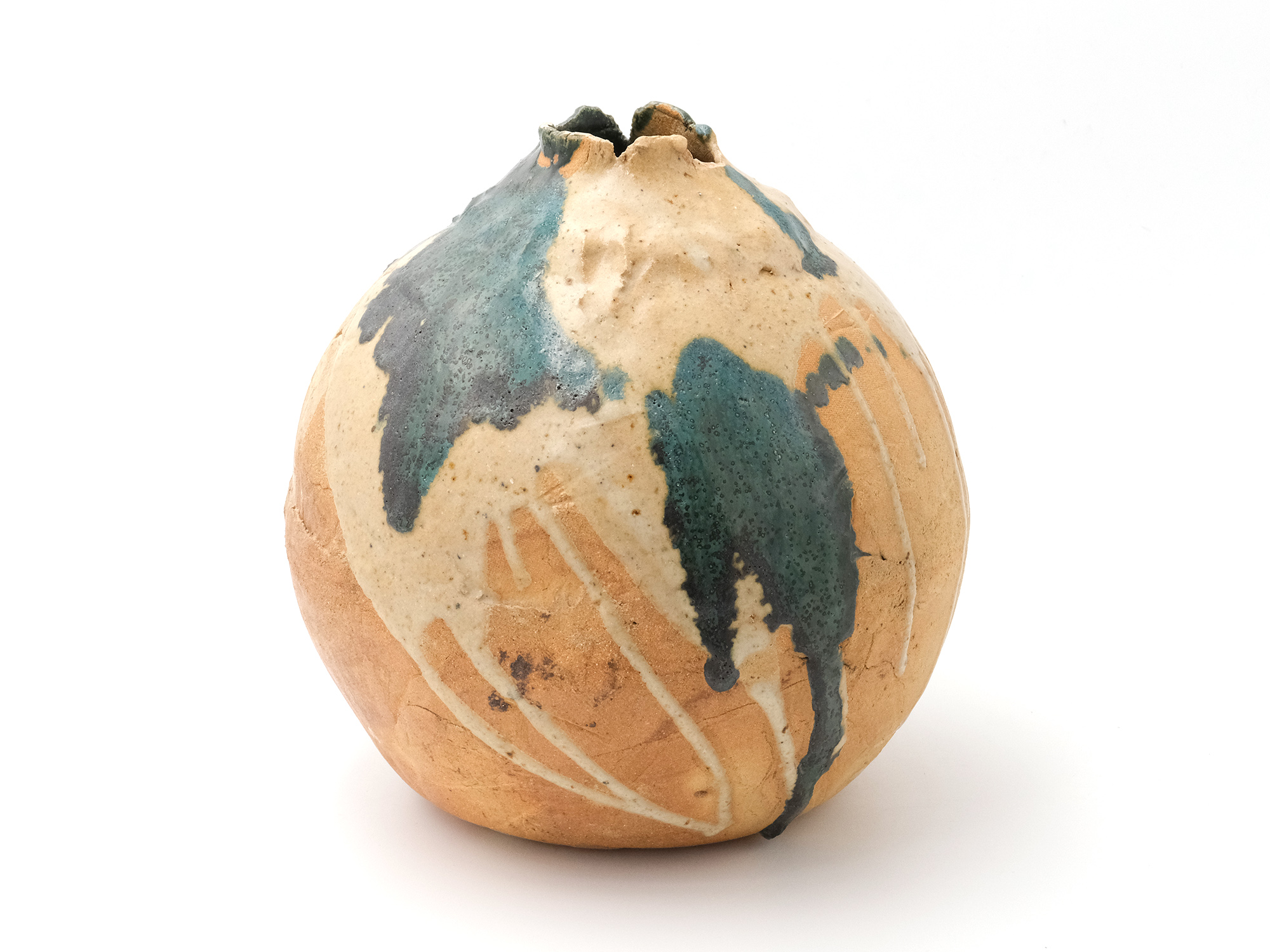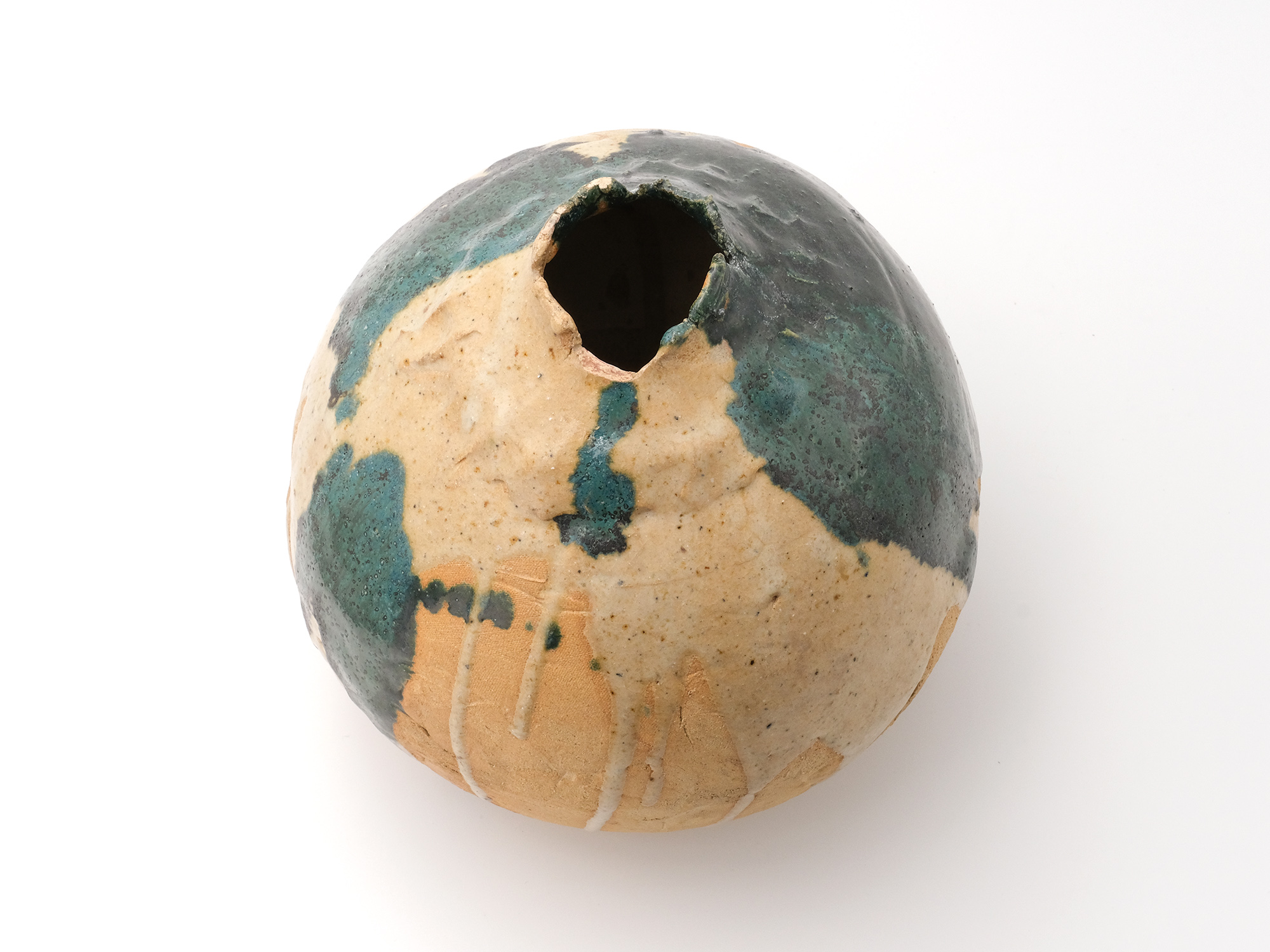 陶芸家は、弊廊でも馴染みのあるアンドシュ・プローデルさんで、パリから南南西に進み、赤ワインで有名なボルドーの手前にあるルビニャックという美しい村で懸命に作陶されています。 その作品は、球体の形を基本とした花入やオブジェ、そして茶の湯に魅せられたとおっしゃり、茶碗にも挑まれています。 大胆な薬がけが彼の真骨頂であり、その佇まいに、私は共感を抱いております。