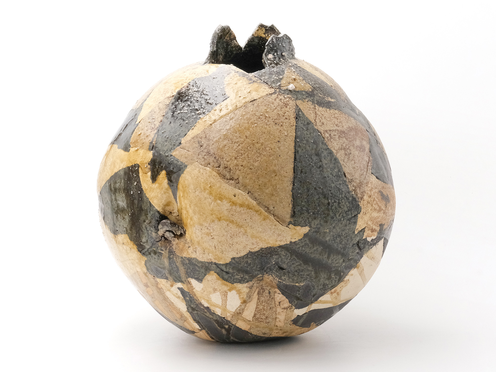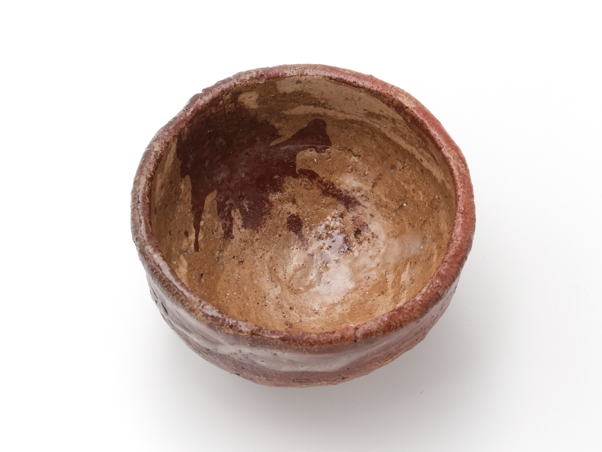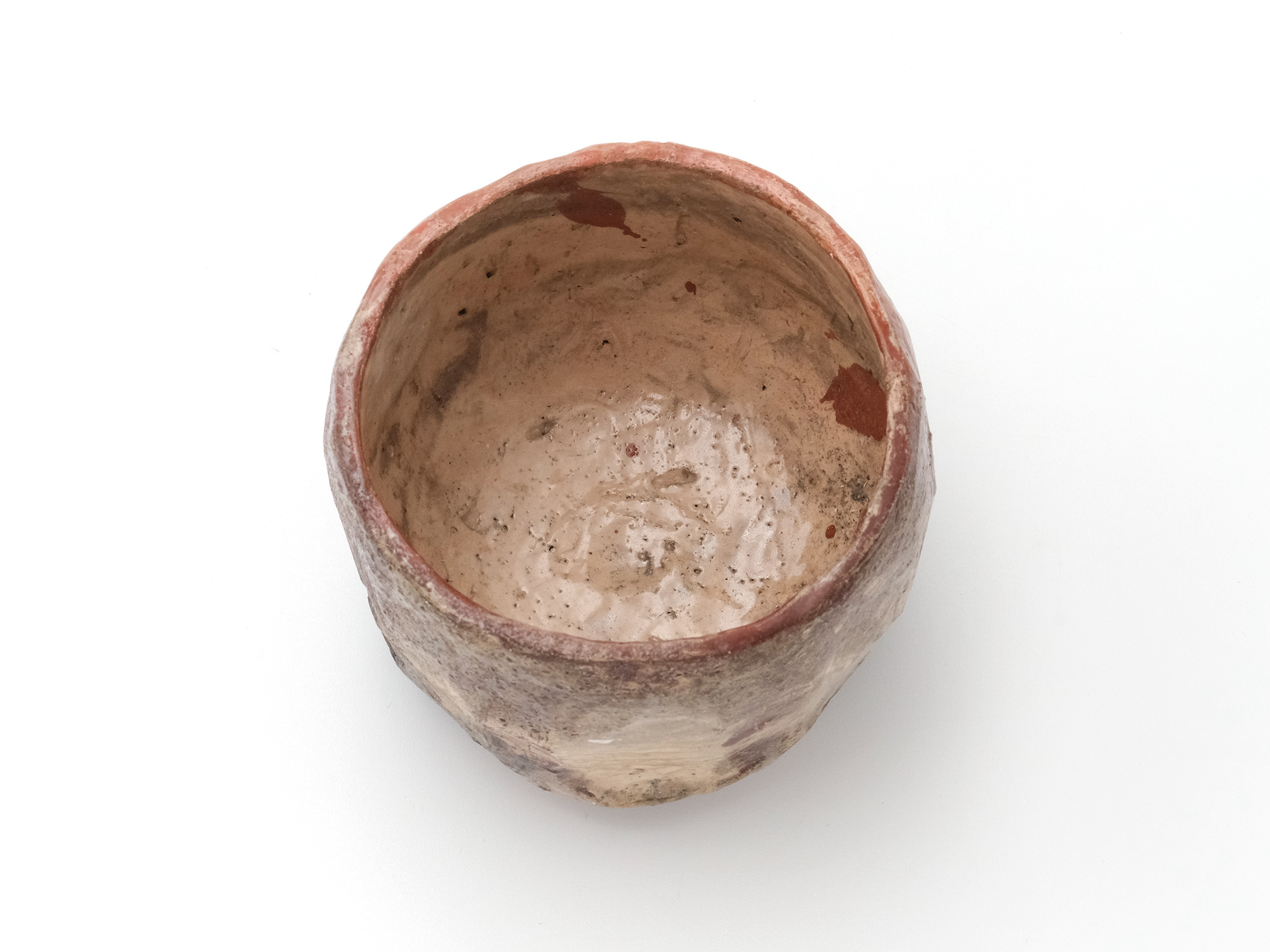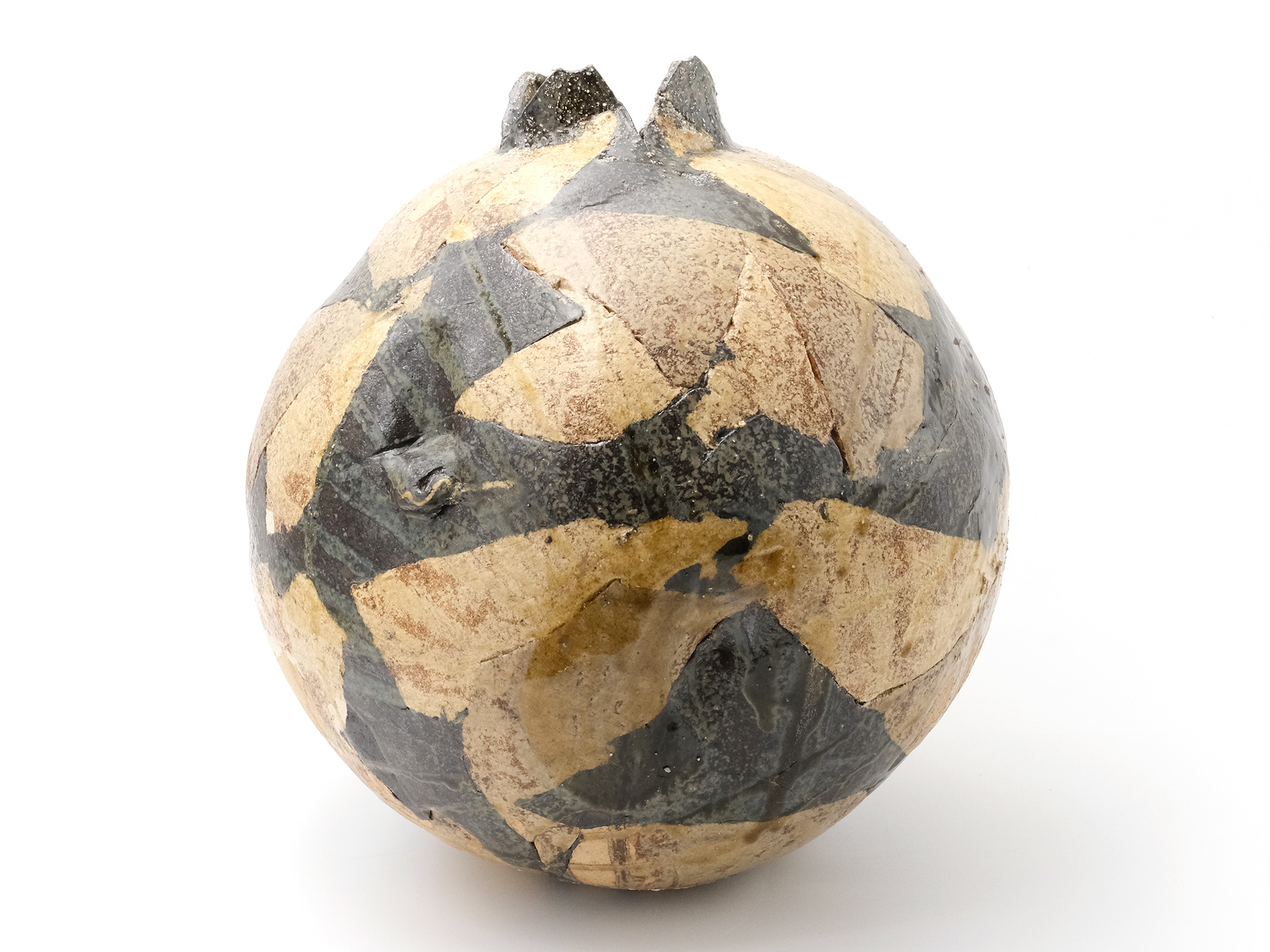 陶芸家は、弊廊でも馴染みのあるアンドシュ・プローデルさんで、パリから南南西に進み、赤ワインで有名なボルドーの手前にあるルビニャックという美しい村で懸命に作陶されています。 その作品は、球体の形を基本とした花入やオブジェ、そして茶の湯に魅せられたとおっしゃり、茶碗にも挑まれています。 大胆な薬がけが彼の真骨頂であり、その佇まいに、私は共感を抱いております。