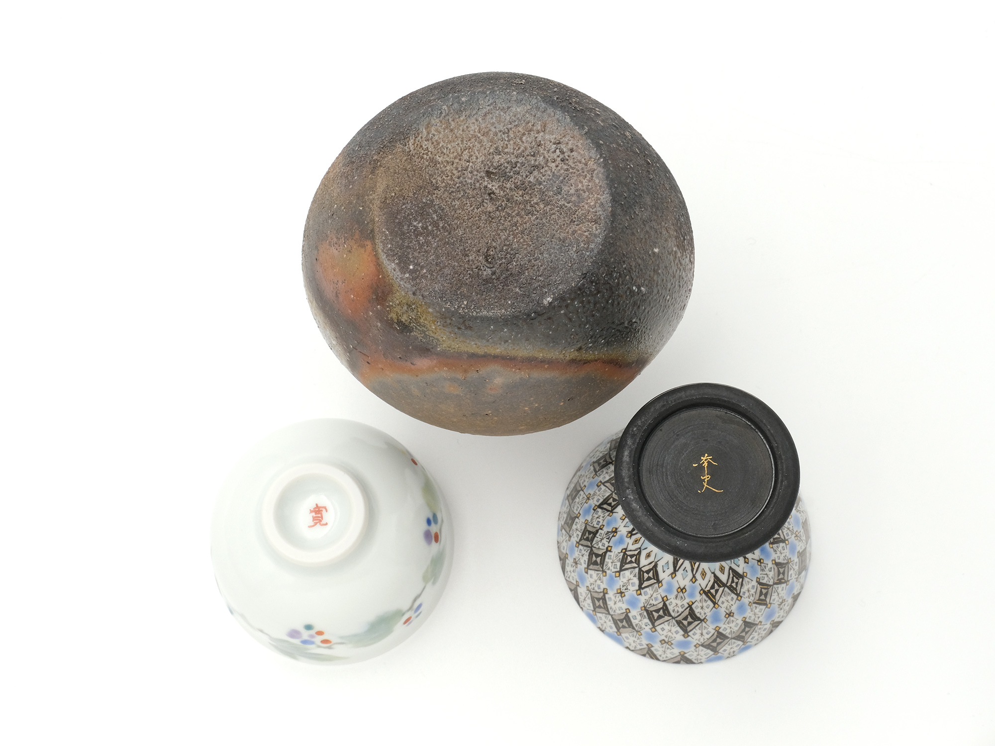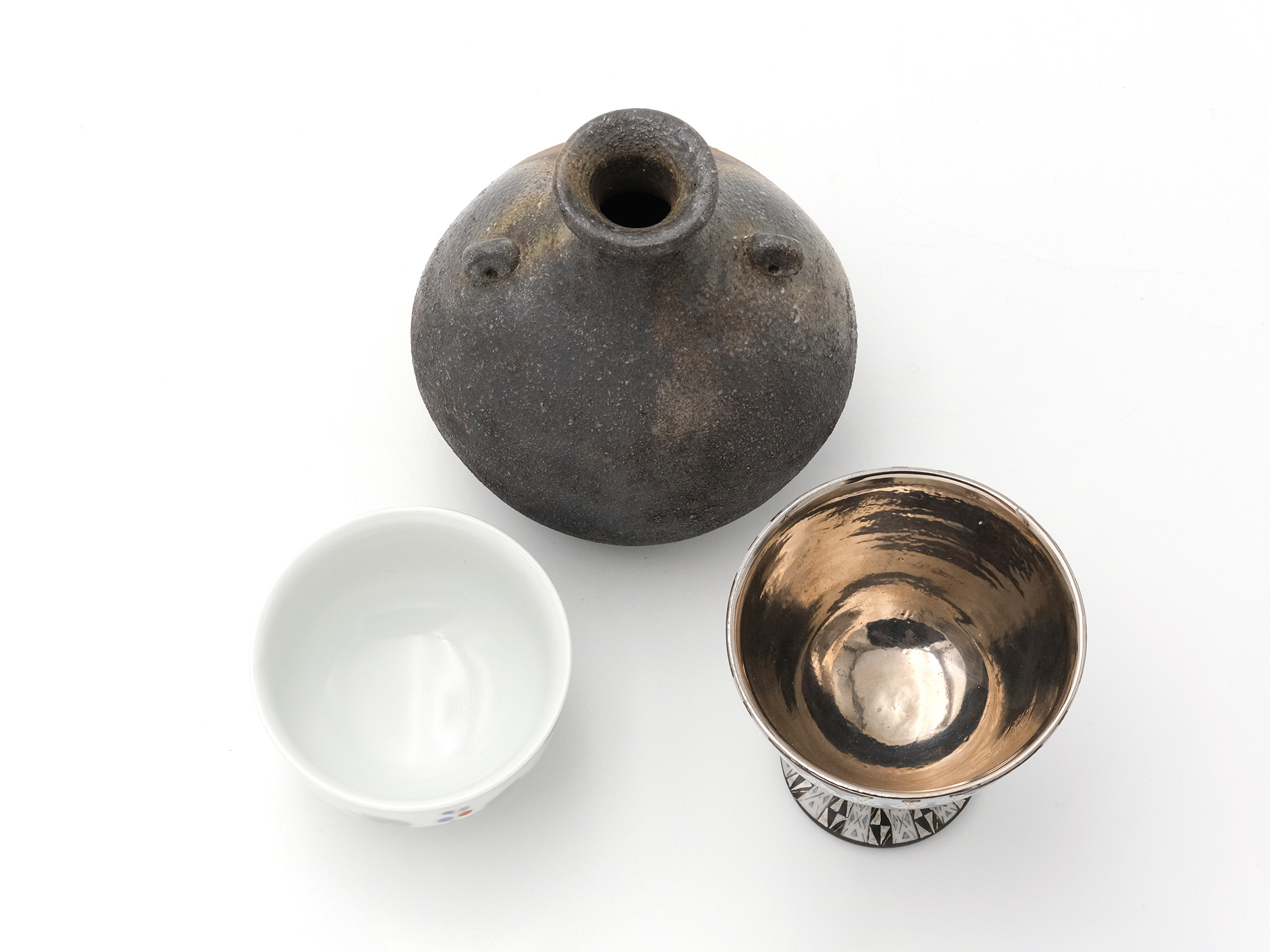 | 作品名 | [左] 色絵野ぶどう盃【ご売約済】 [中] 備前窯変耳付扁壺徳利 [右] 幾何紋金彩洋盃 |