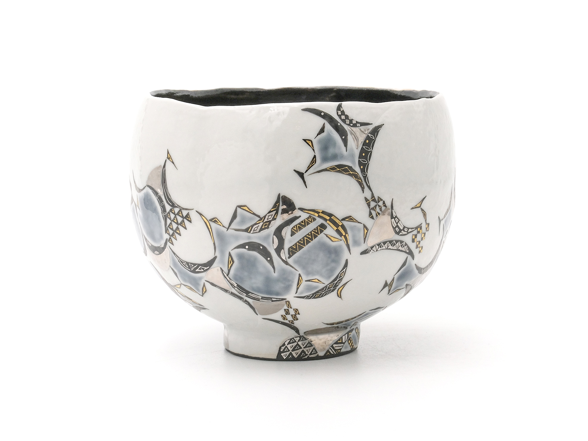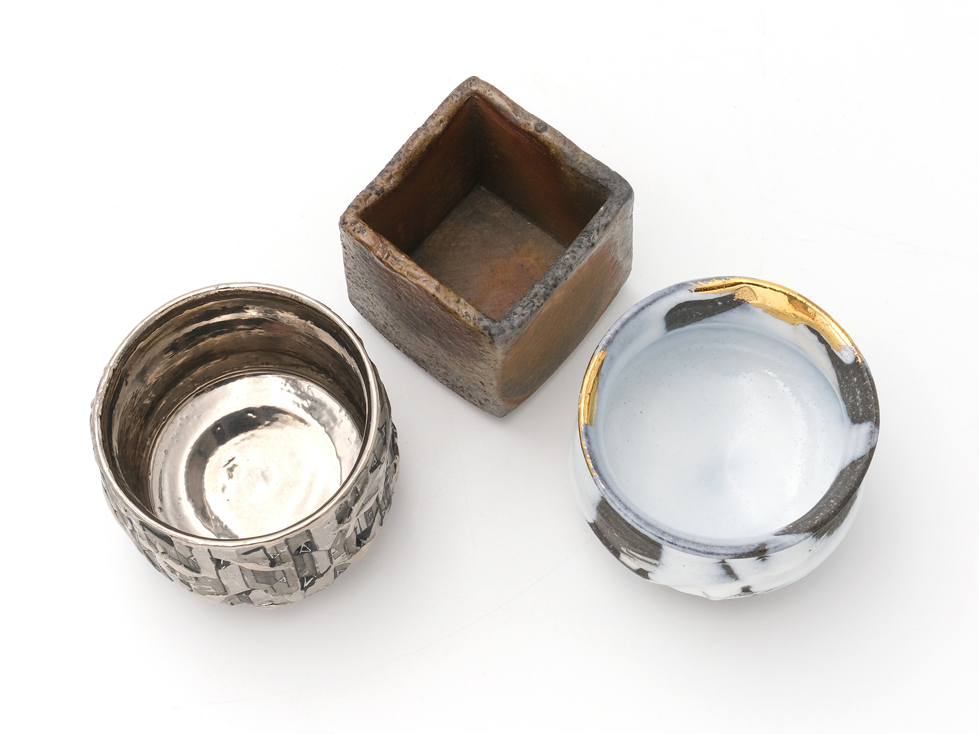 | 作品名 | [左] 葉紋白金彩ぐい呑 [中] 備前窯変角酒呑【ご売約済】 [右] 白釉龍水文盃 |