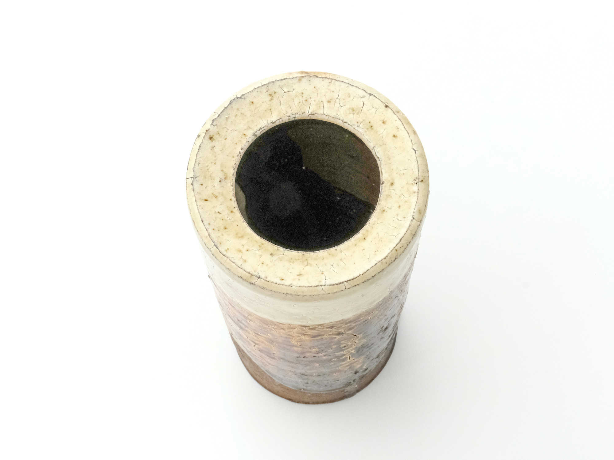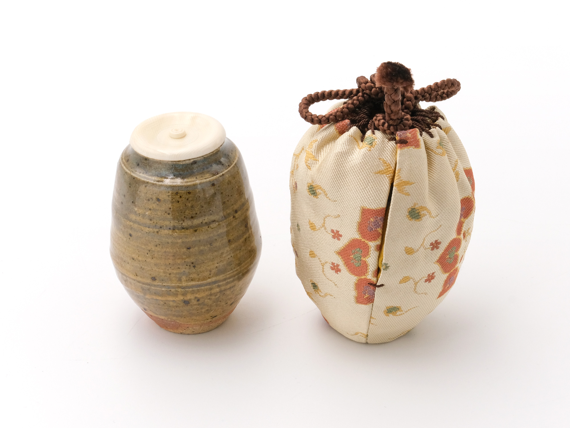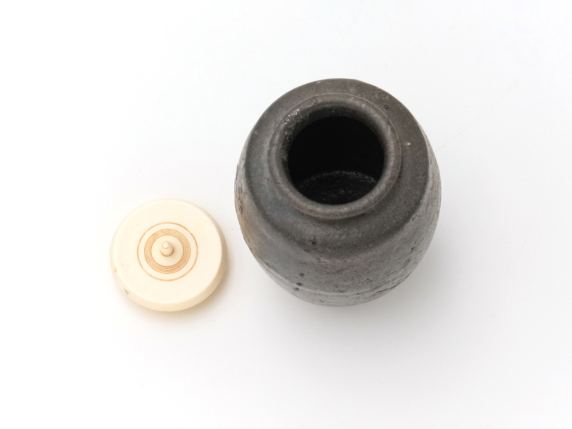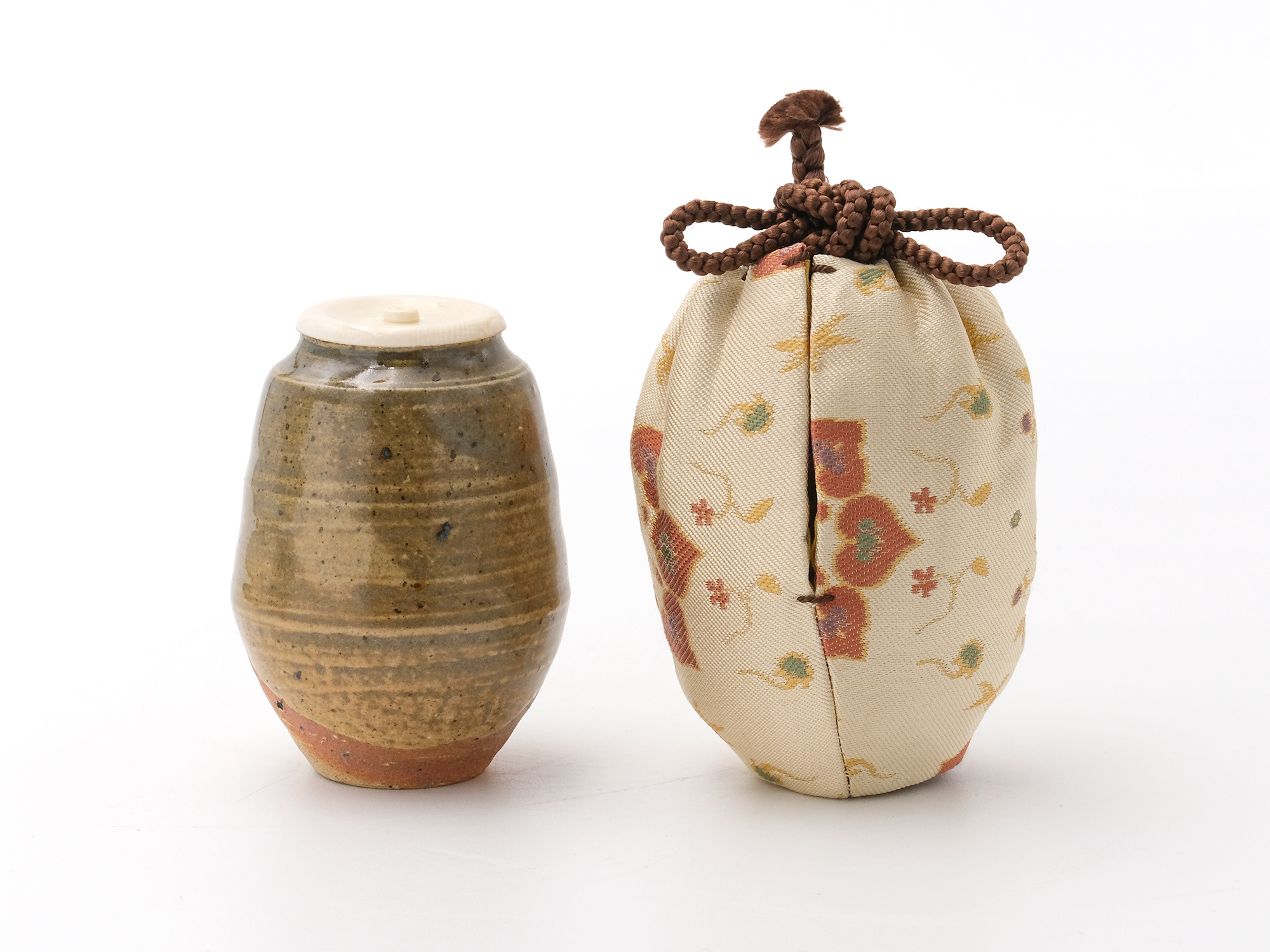 三藤るいの《唐津鶴首花入》は、下膨らみのあるまるい胴からすらりと長頸が伸びた、如何にも女性らしさを感じる花入である。 元来は銅器を写したものであったが、やきものならではの自然な歪みが、むしろ深い味わいを醸し出している。