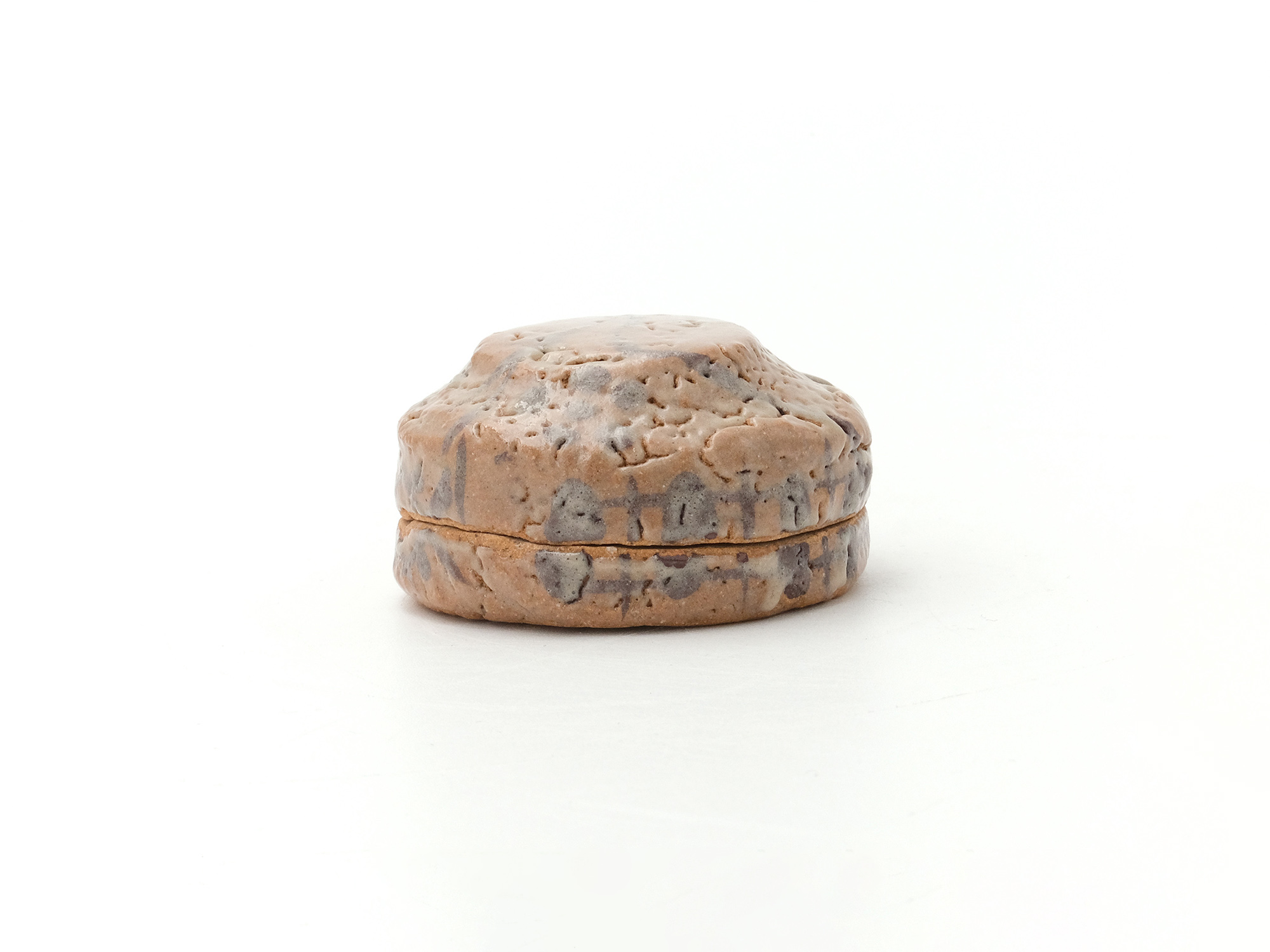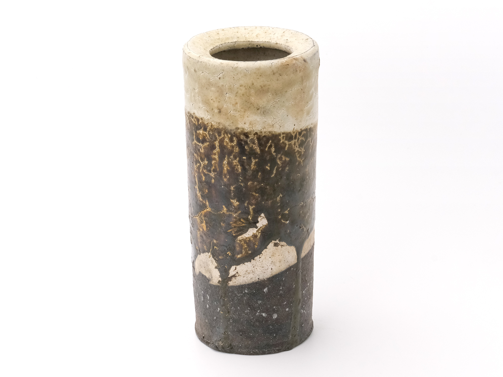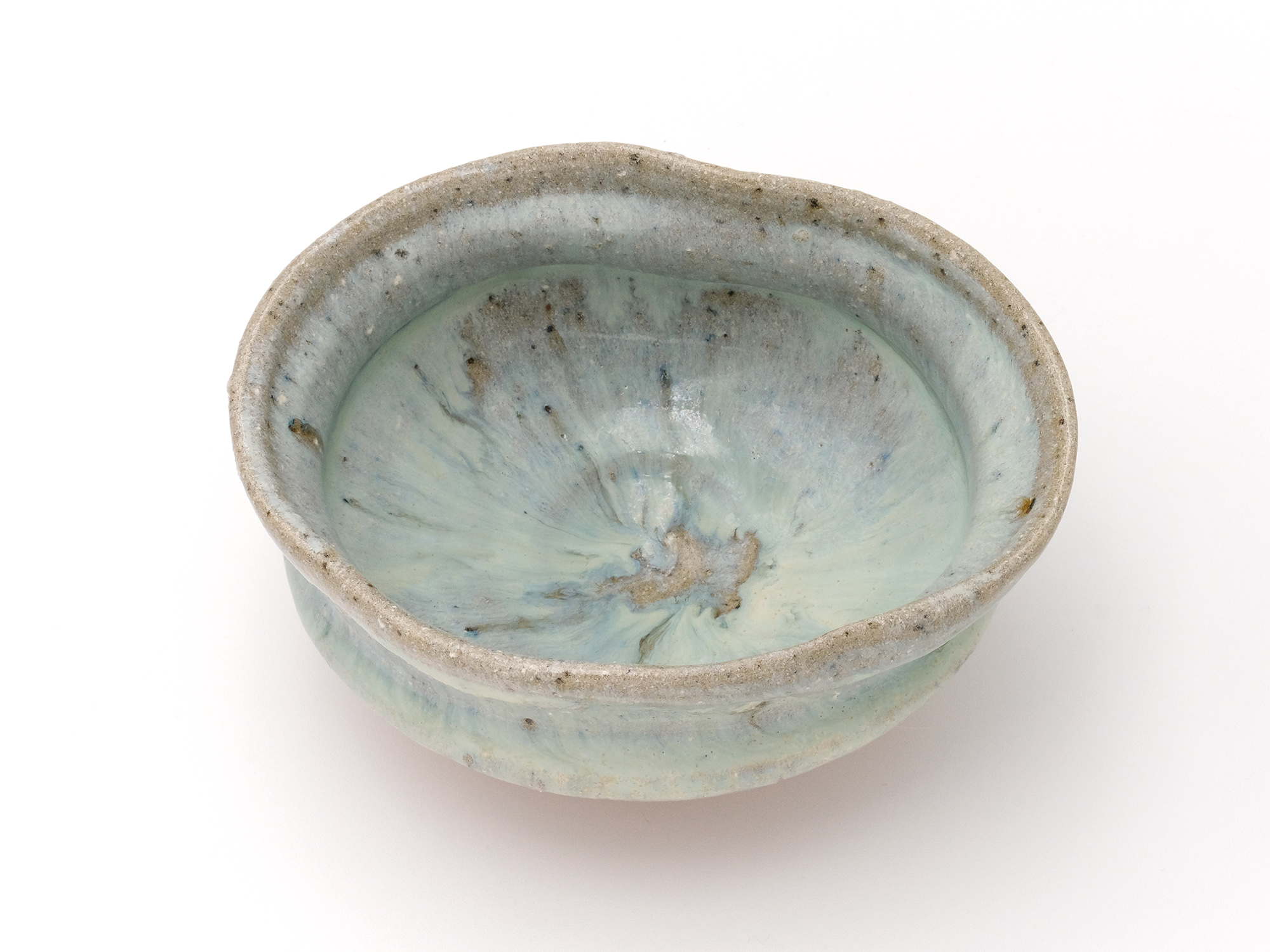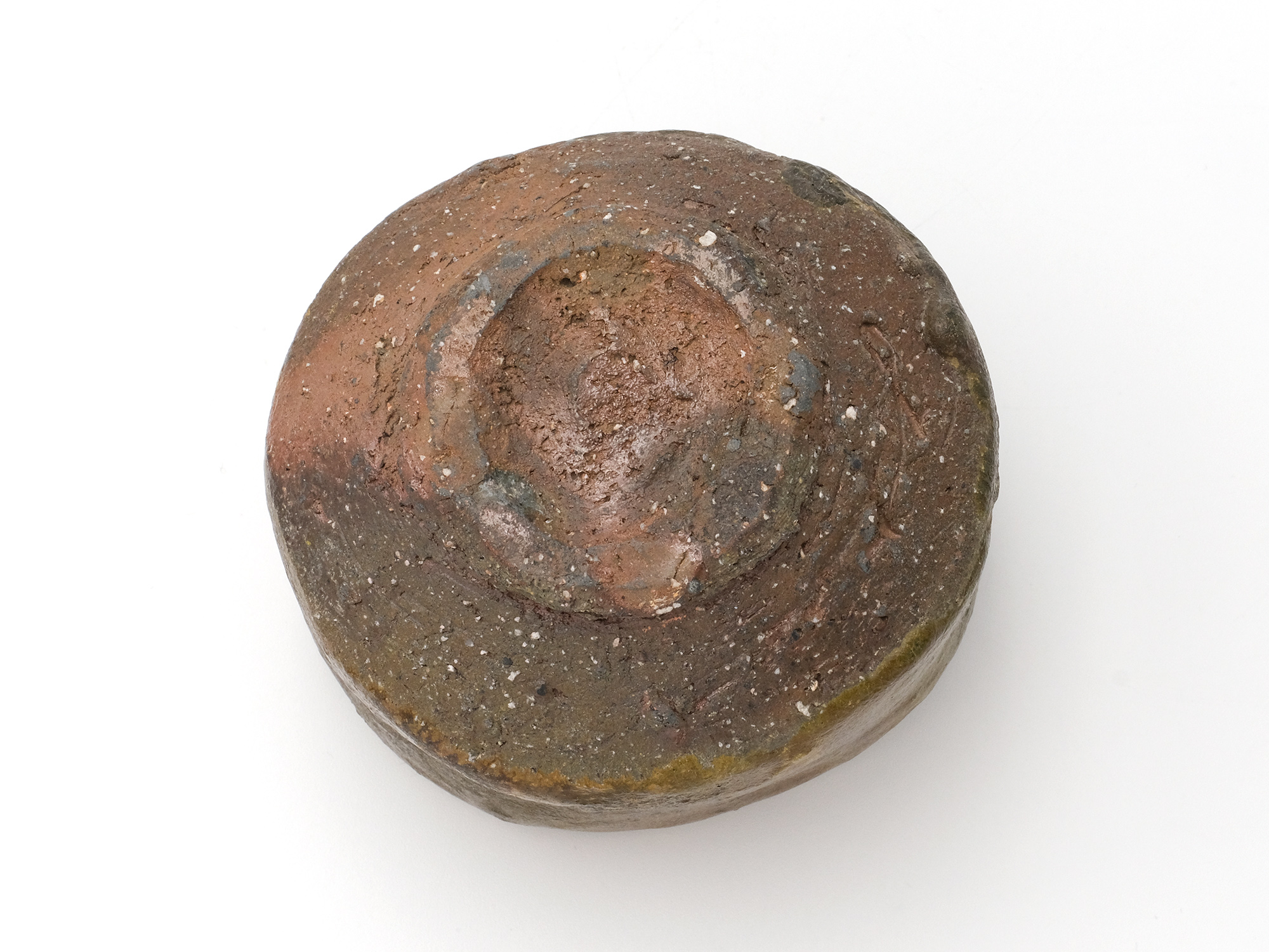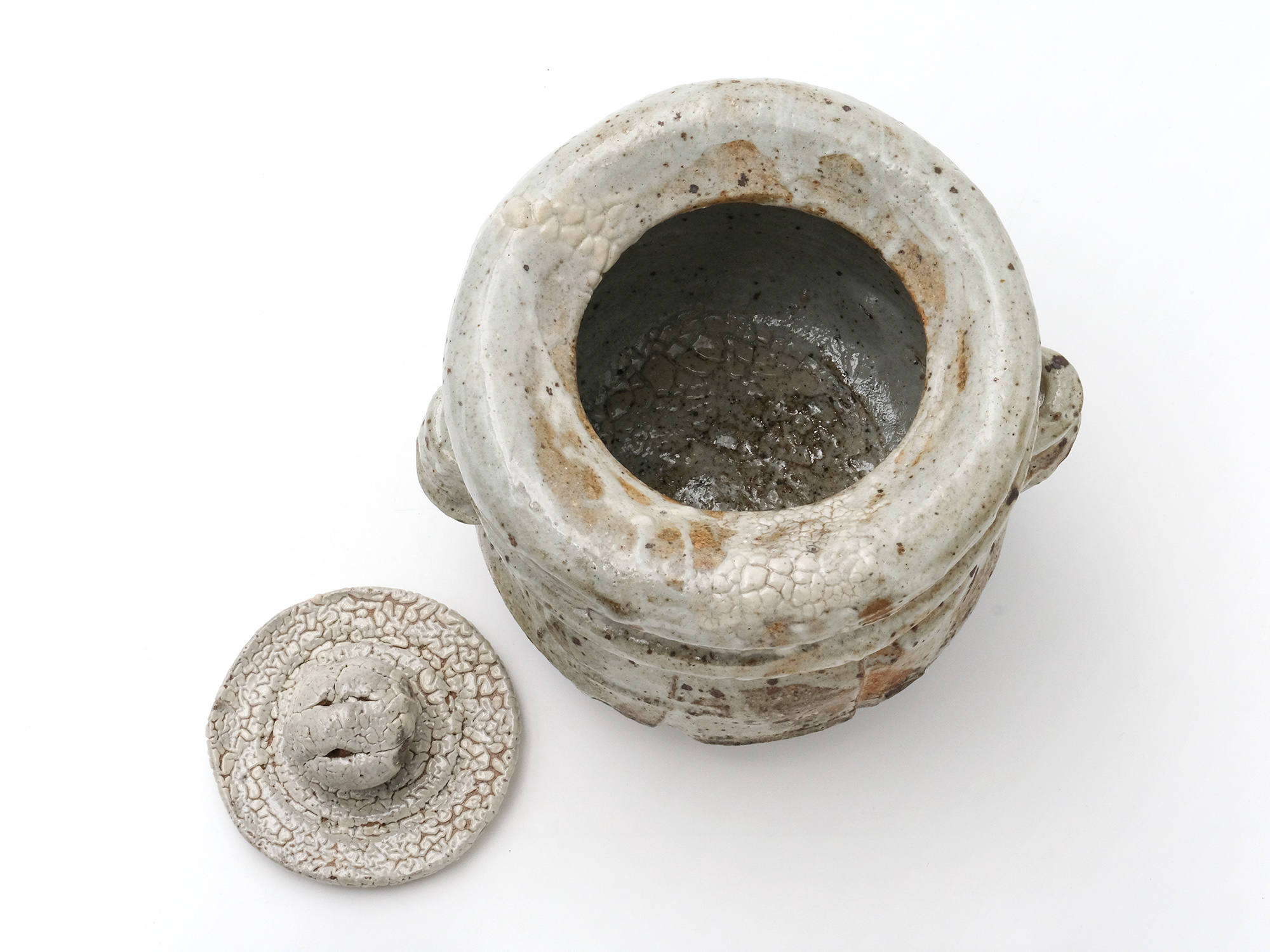 岡本作礼が織部風の朝鮮唐津に挑戦しはじめたのは、第四回展の時からだったか。 本展の《朝鮮唐津窯変耳付水指》を見ると、釉薬をわざと掛けはずすことで模様と造形の一体感を生み出し、岡本独自の朝鮮唐津となっている。 精神の自由という本源に帰っての制作である。