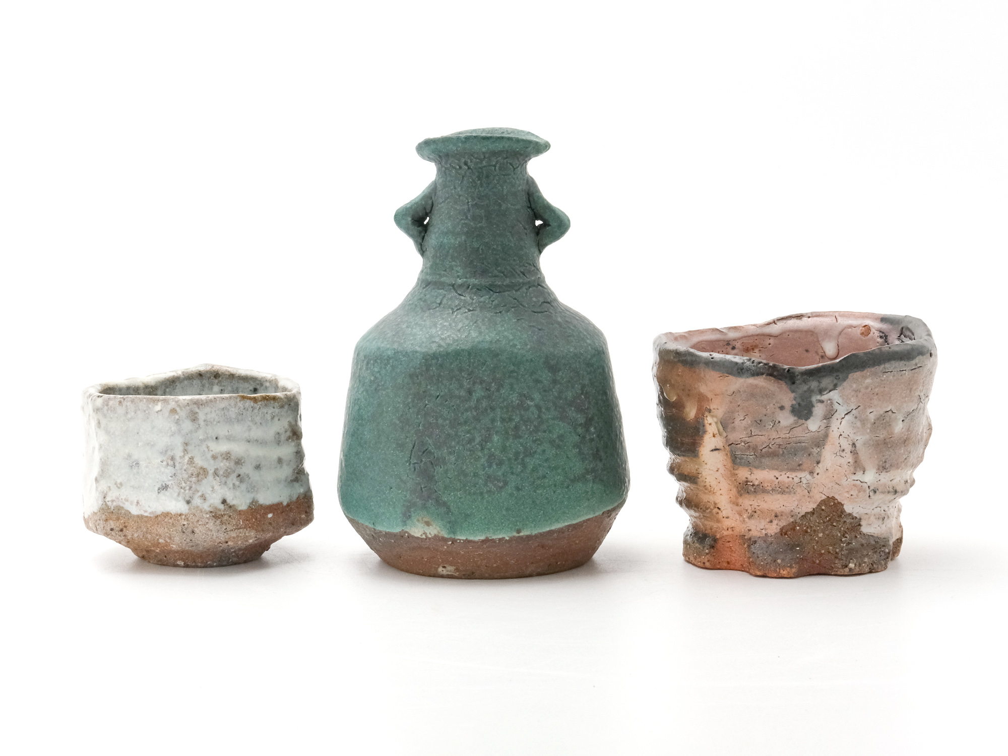 | 作品名 | [左] 斑唐津ぐい呑 [中] 萌黄徳利 [右] 丹心武者盃 |