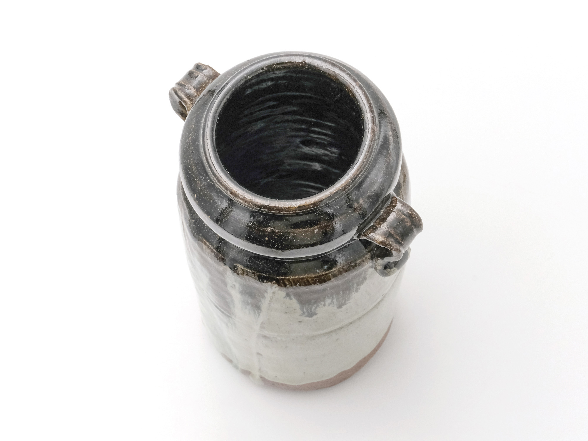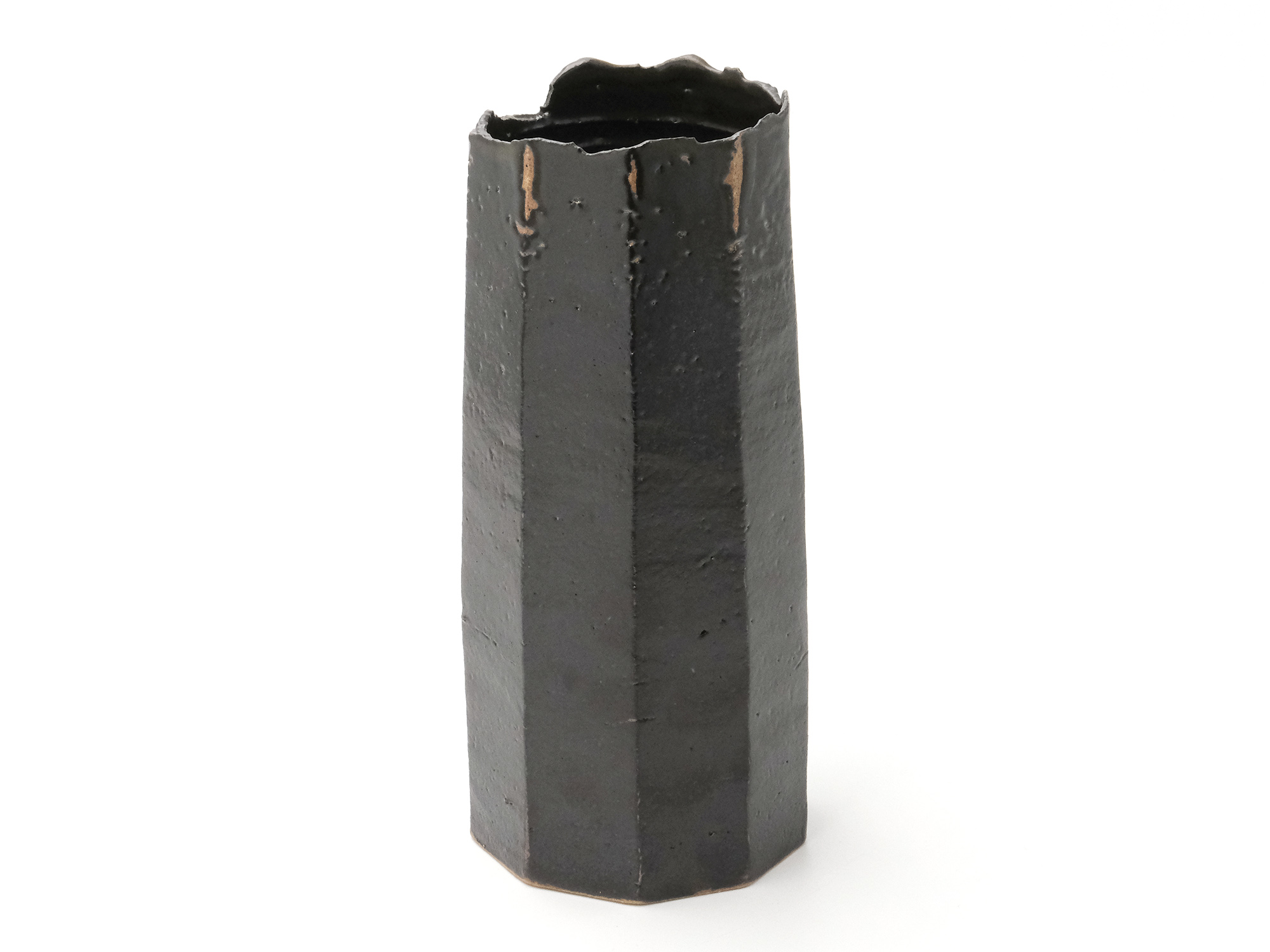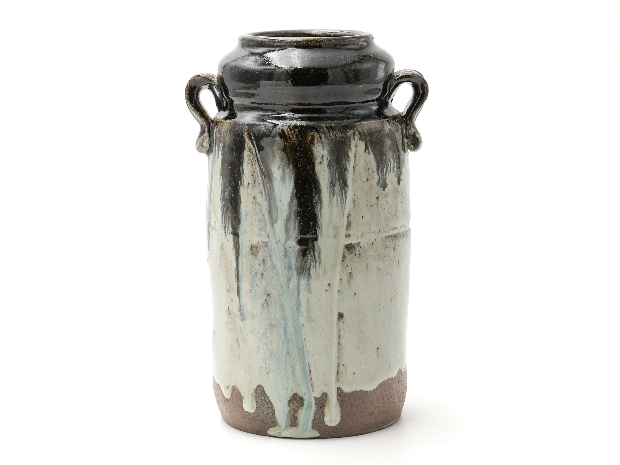 川上清美の《黒唐津大壺》は、桃山以前の唐津焼に挑戦した改新作である。 黒唐津とは、木灰釉に鉄の含有量の多い岩石の入った釉を掛けて焼成したものだが、本作は柿色に発色した釉肌の上を黒釉が激しく流れている。 生きることの本源を問うた渾身の大壺である。