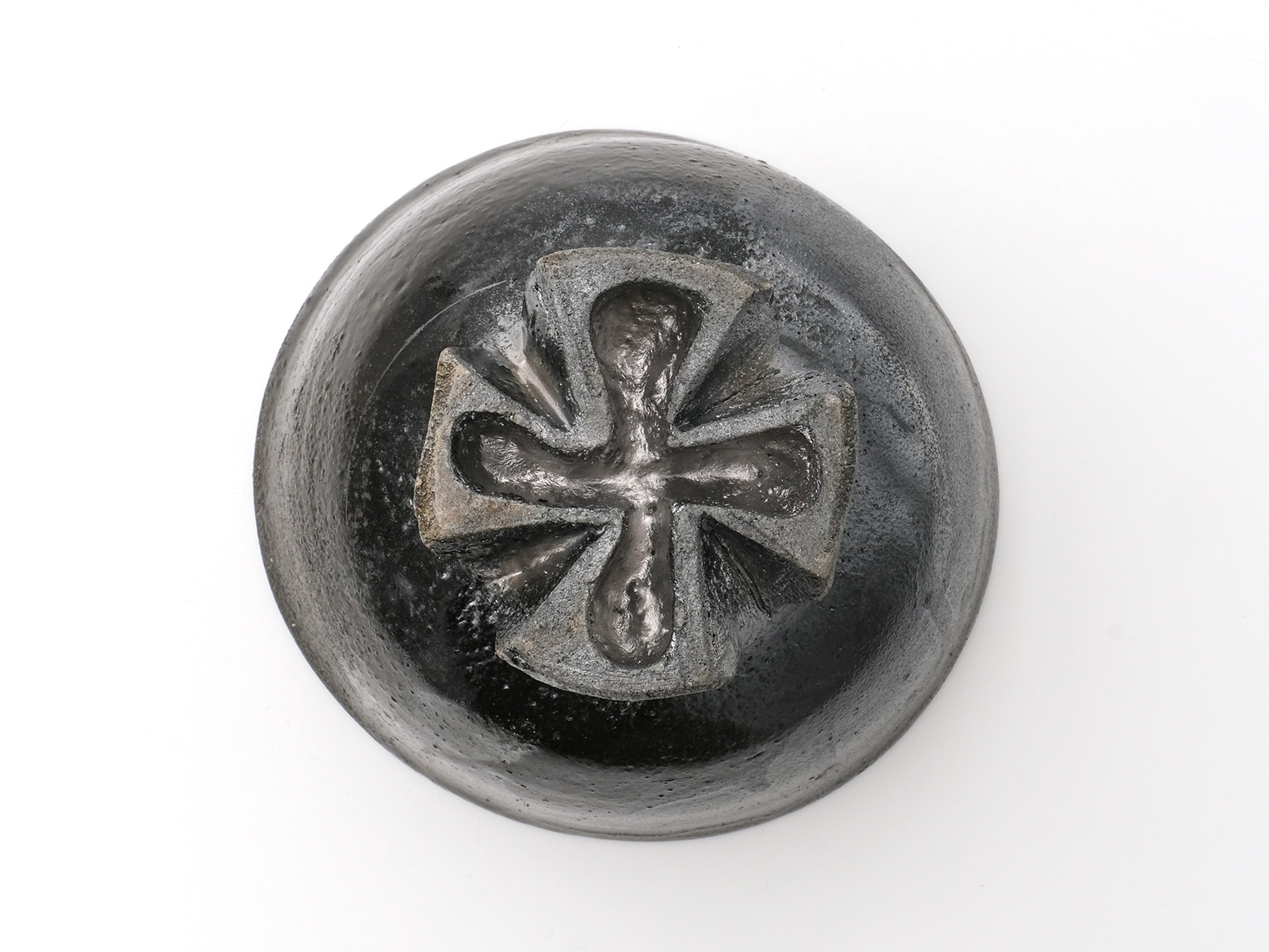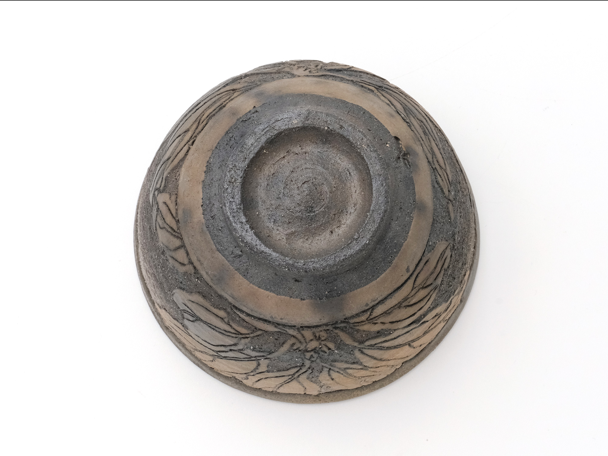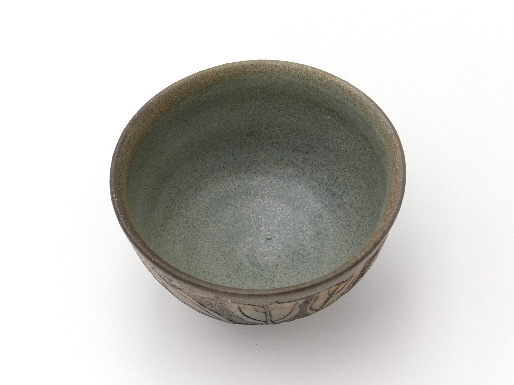 十四代 中里太郎右衛門の《唐津太郎右衛門青掻落し茶盌》は、生乾きの素地の上に黒土を塗り、一部を削ってシロダモの葉を描いている。 太郎右衛門ブルーと呼ばれる独自の色を作り出し、十四代ならではの独自の美の世界を表現している。