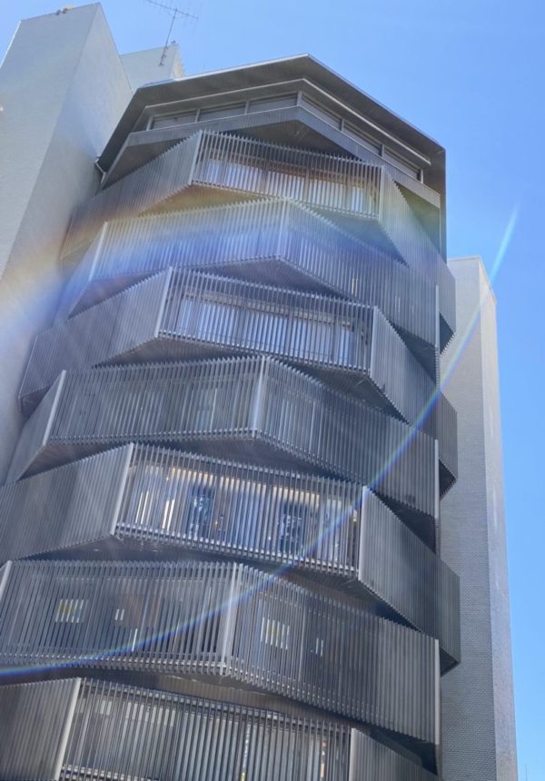 このビルは、陽光を受け眩しい弊廊のある安与ビルです。